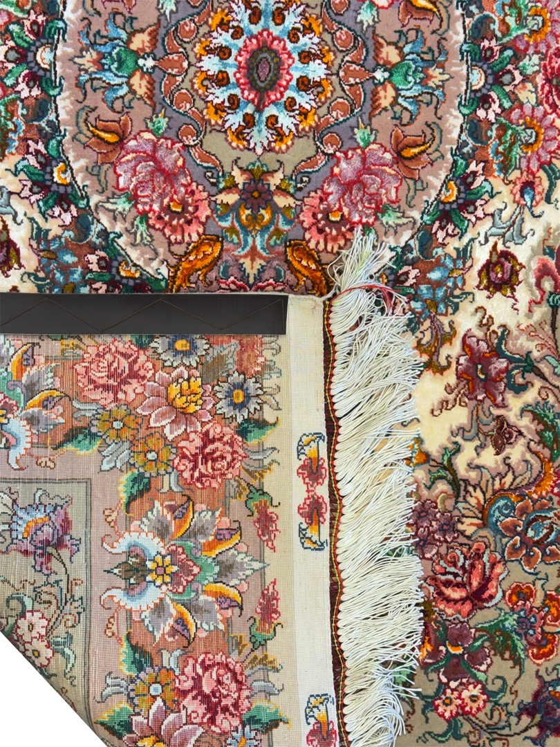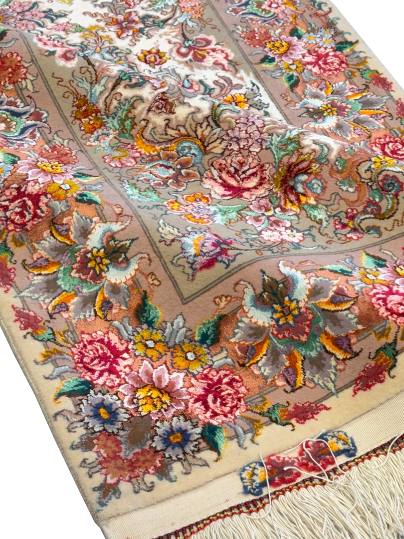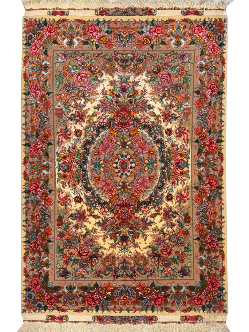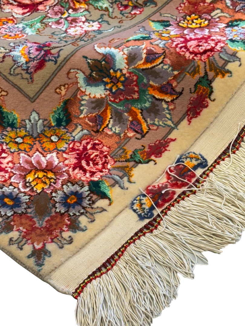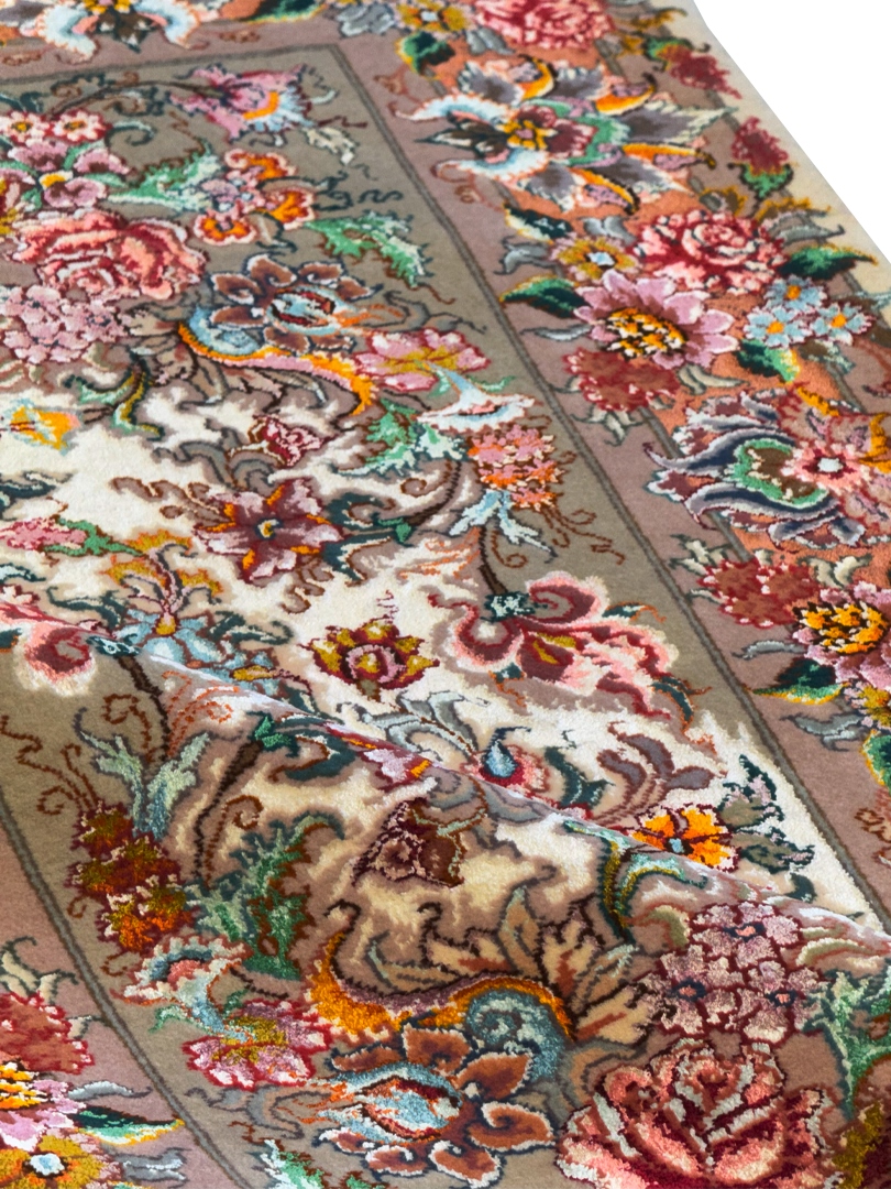 دست بافت تبريز ويژه 100*150 مستطيل خطيبي 60 رج کرک و ابريشم شتري کرم نسکافهاي 4 Kg