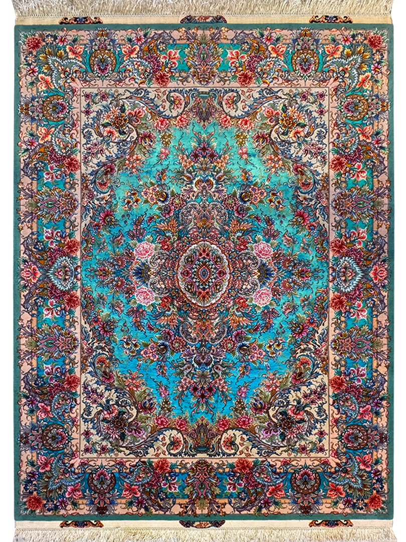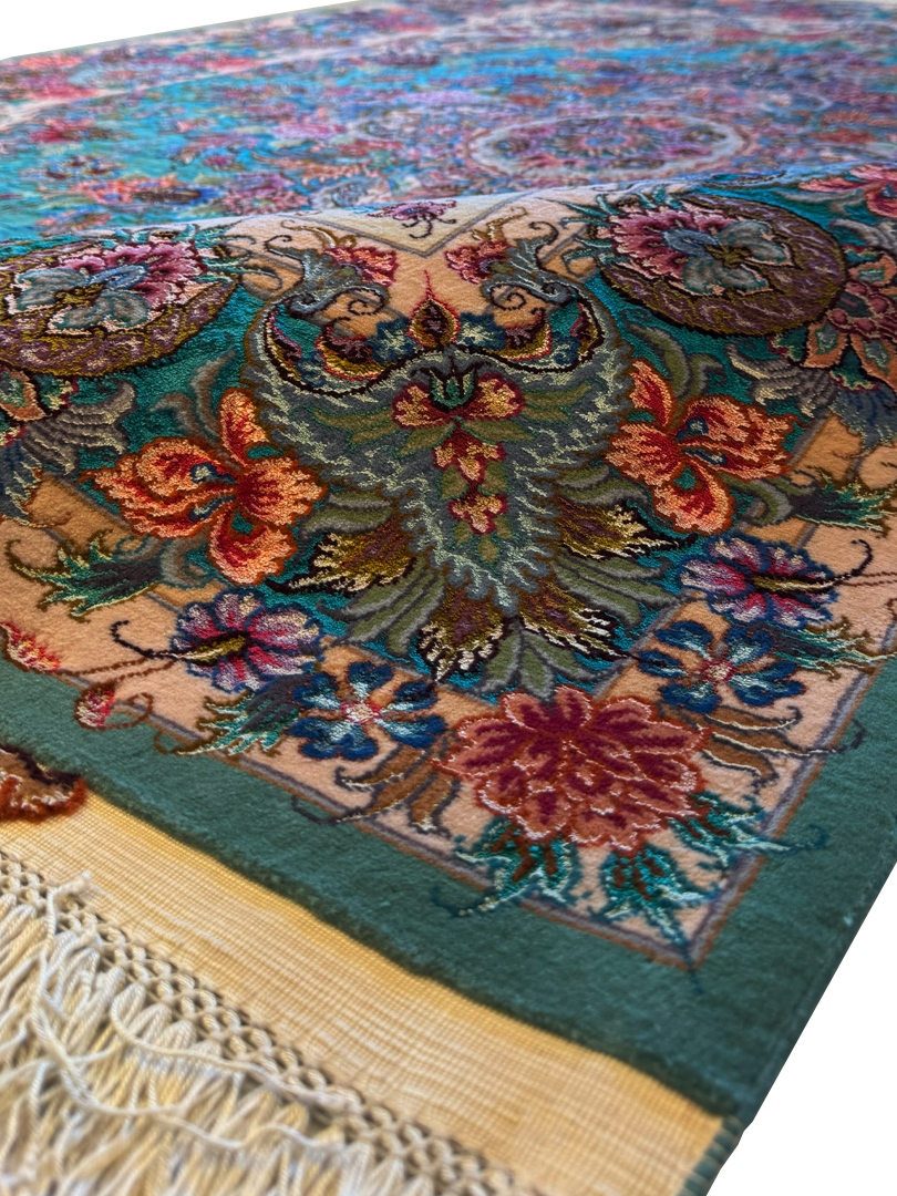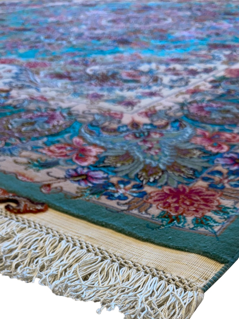 دست بافت تبريز 150*200 مستطيل خطيبي 60 رج کرک و ابريشم آبي فيروزه اي آبي 5 Kg