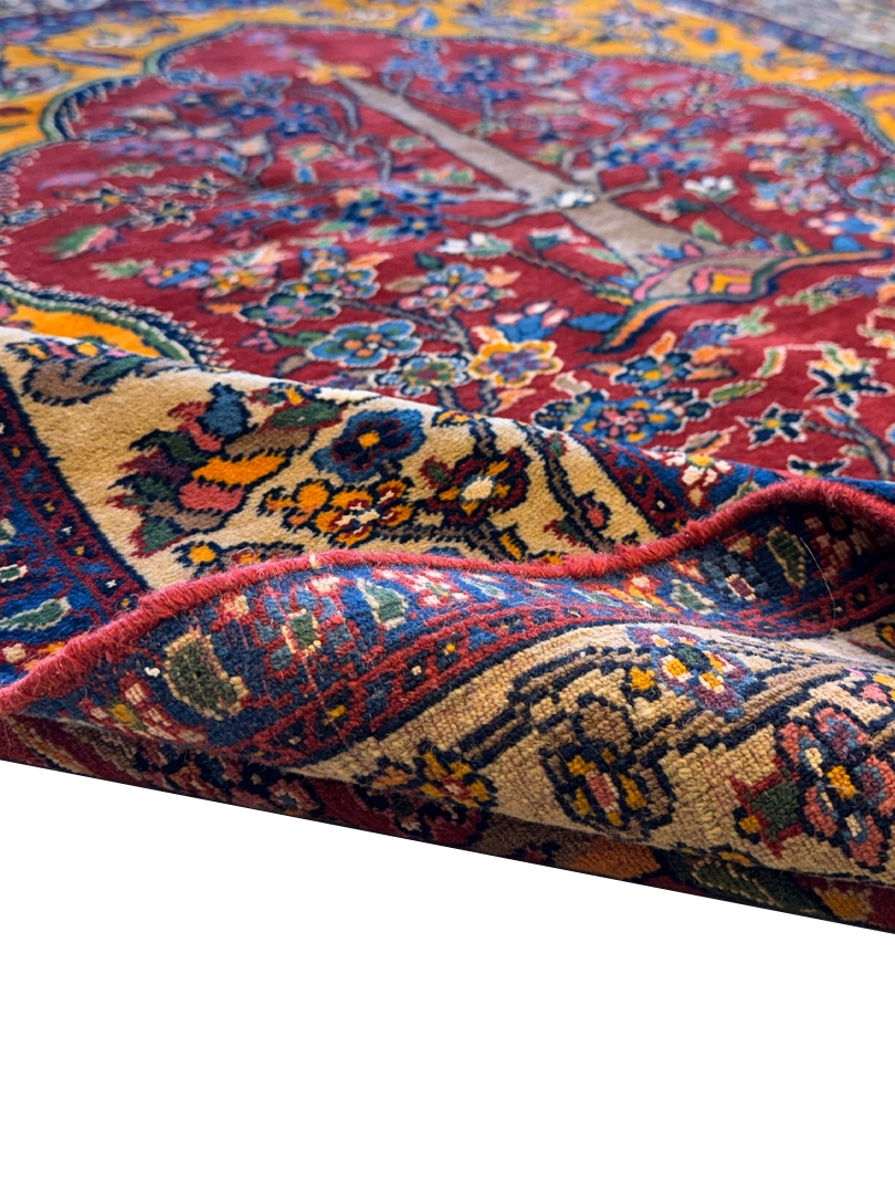 دست بافت قشقايي 200*142 مستطيل دروازه بهشت 45رج پشم و ابريشم لاکي الوان کرم الوان 8 Kg