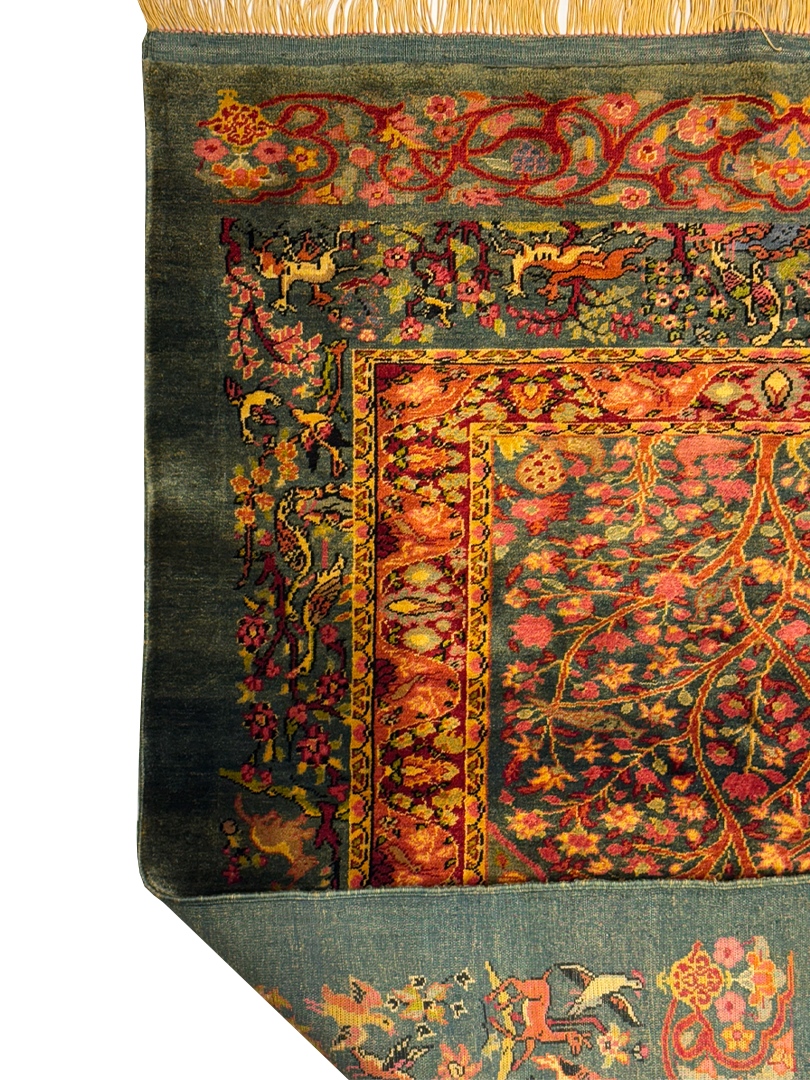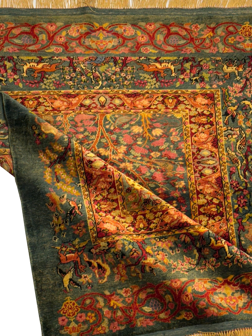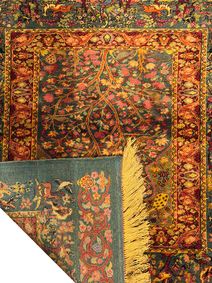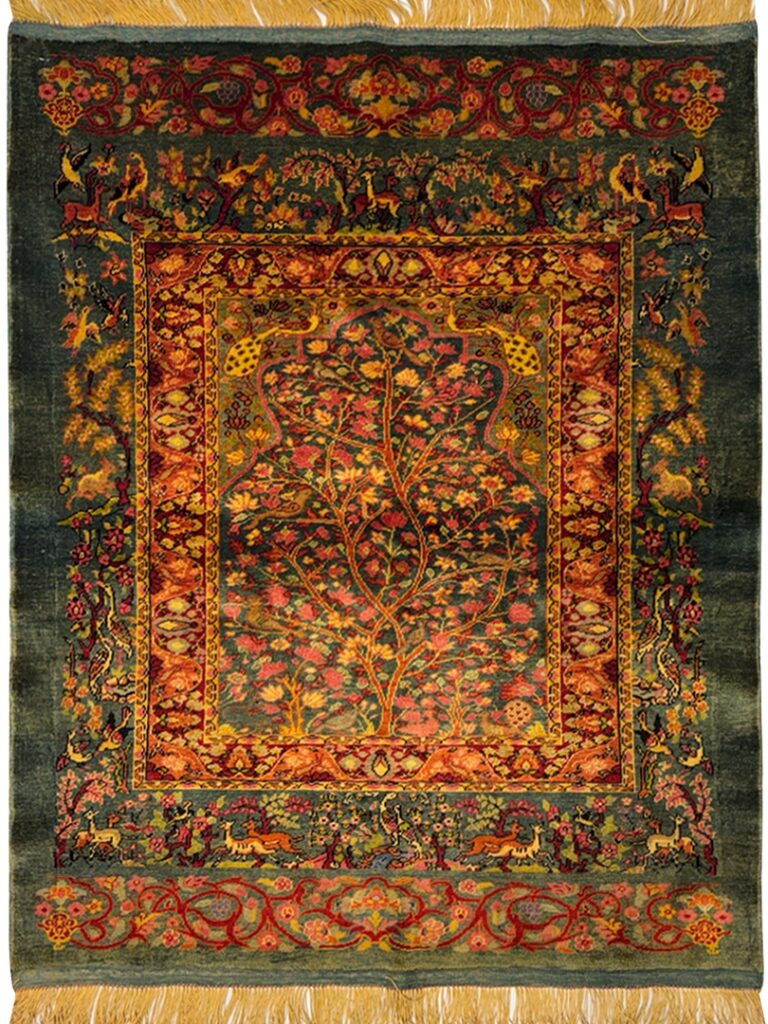 دست بافت خراسان 100*70 مستطيل دروازه بهشت 70 رج تمام ابريشم سبز طلايي سبز 0.5 KG