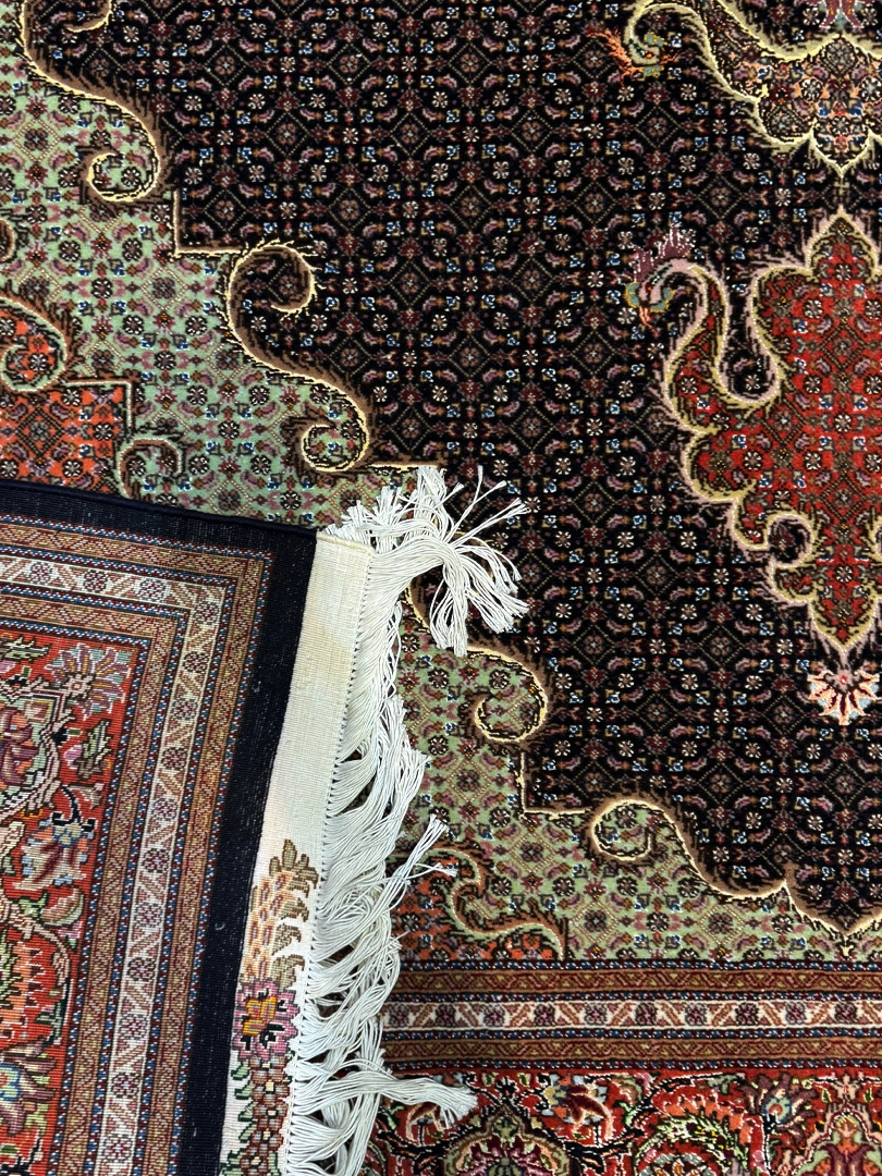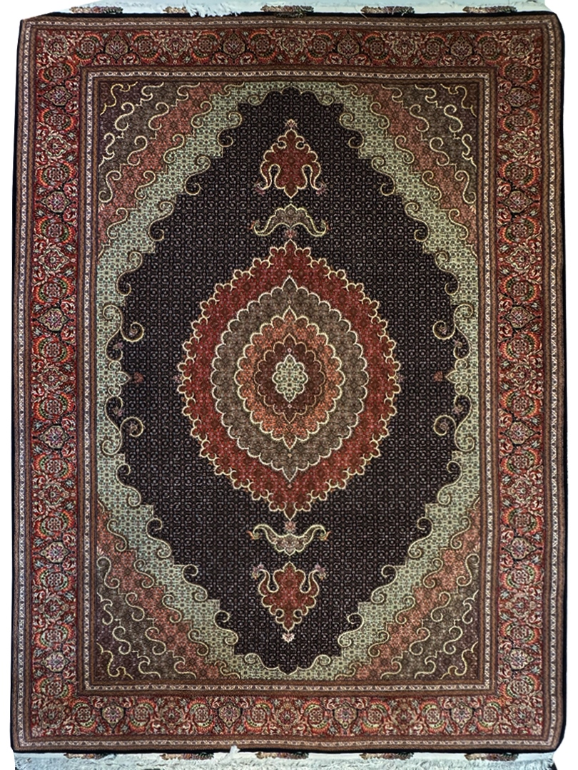 دست بافت تبريز 200*300 مستطيل ريزماهي قاب قراني 50 رج کرک و ابريشم کرم عنابي 25 Kg