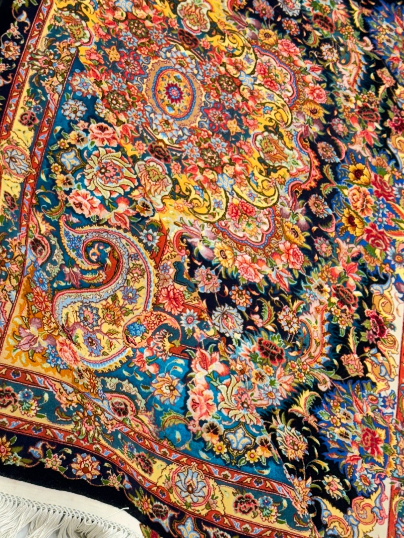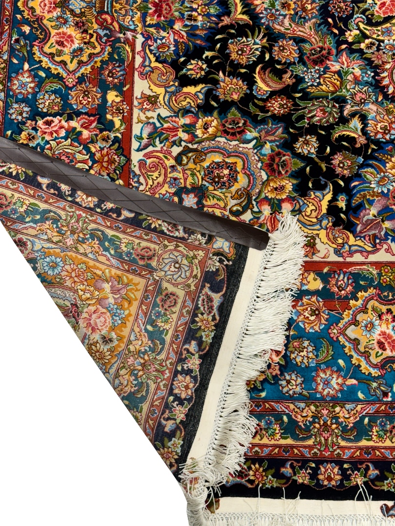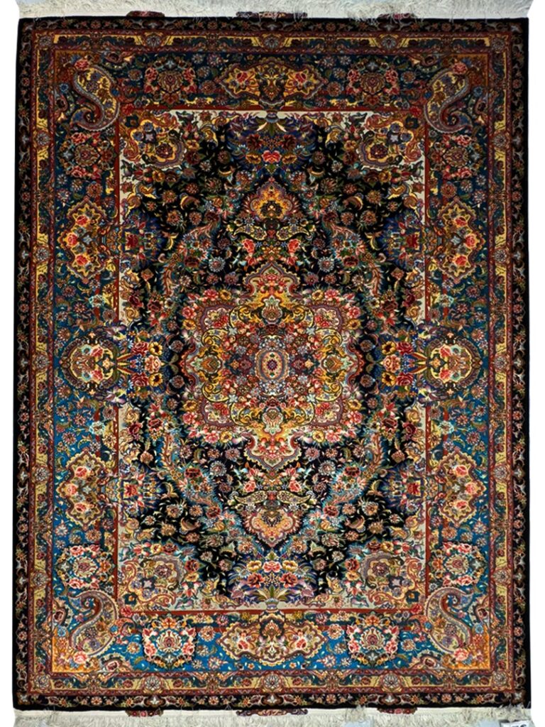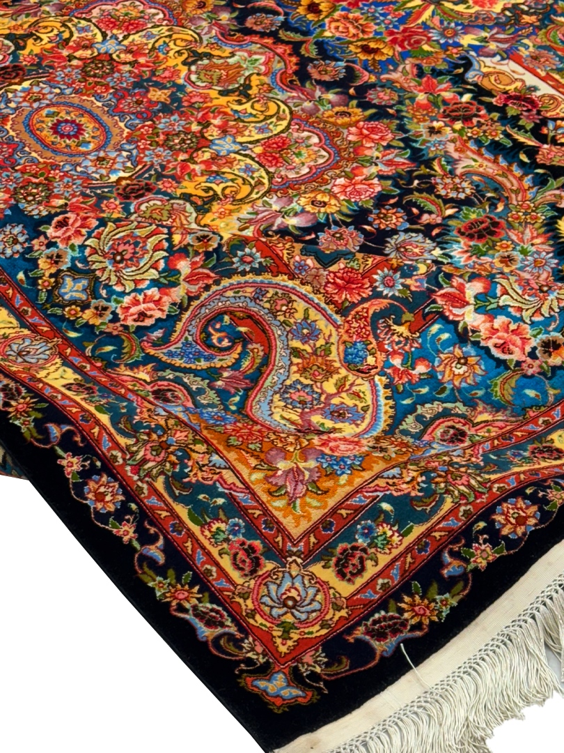 دست بافت تبريز 200*300 مستطيل سالاري باغ بهشت 50 رج کرک و ابريشم مشکي سبز آبي 20 Kg