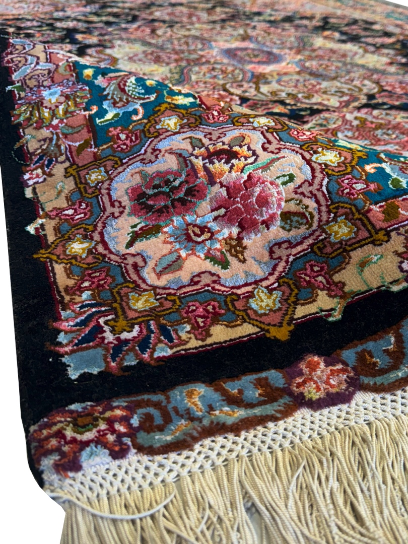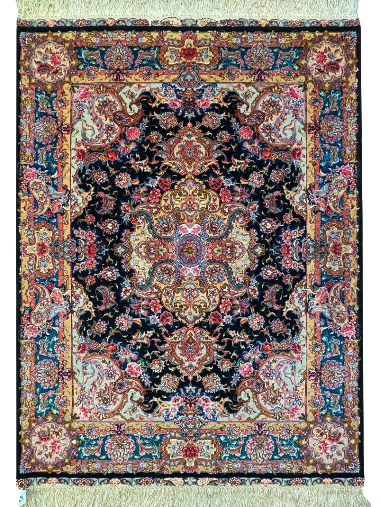 دست بافت تبريز 150*200 مستطيل سالاري 50 رج کرک و ابريشم سورمهاي آبي فيروزه اي 8 Kg