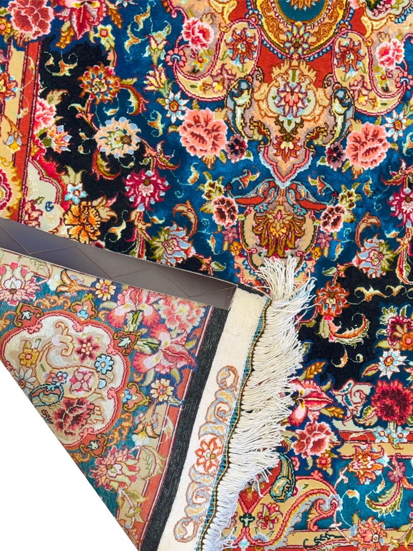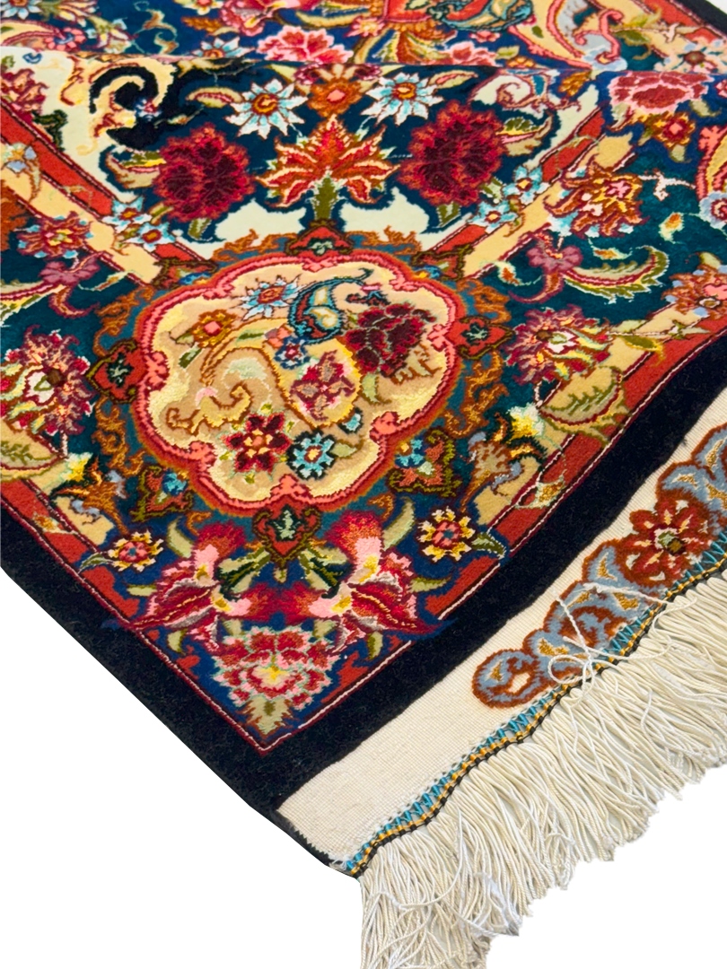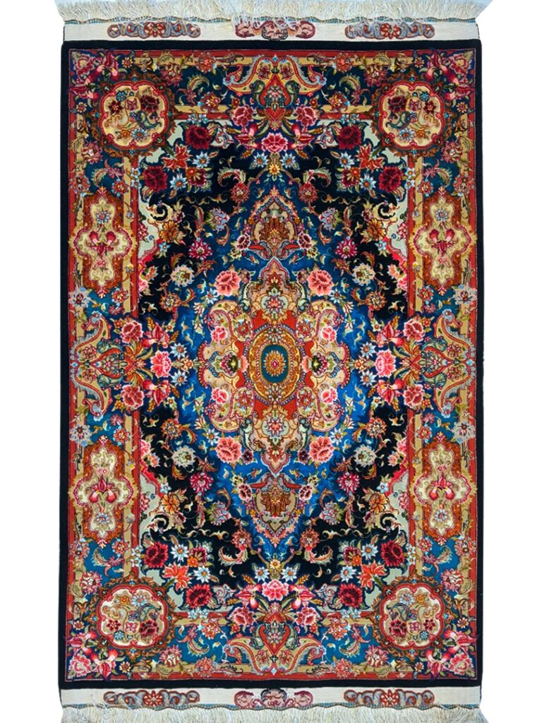 دست بافت تبريز 100*150 مستطيل سالاري 50 رج کرک و ابريشم مشکي الوان سبز آبي 3 Kg