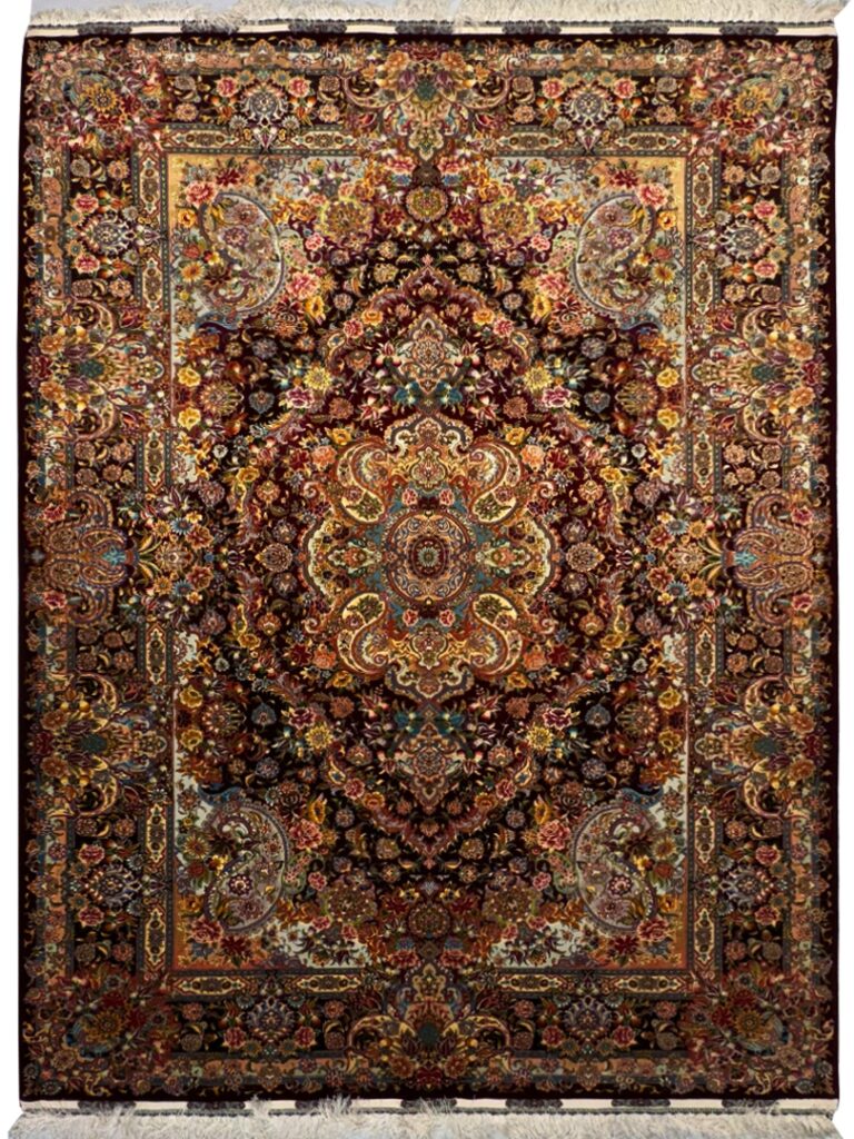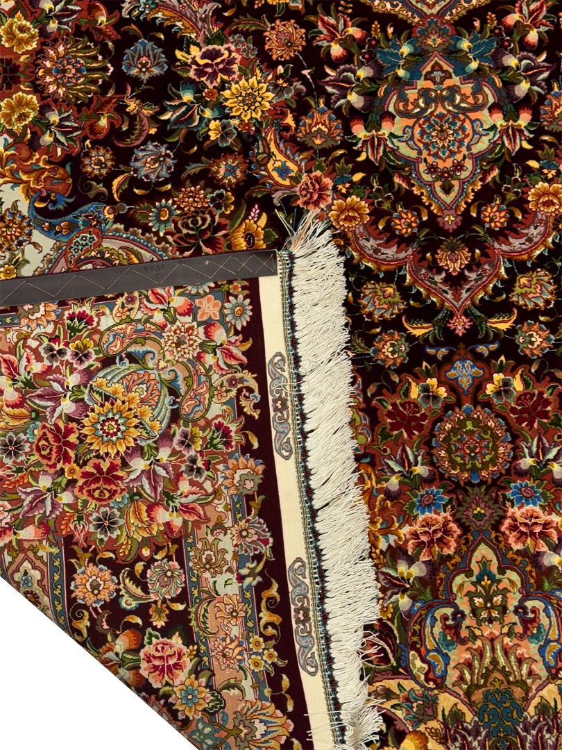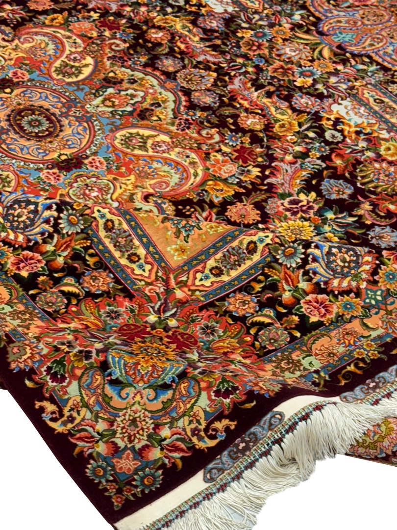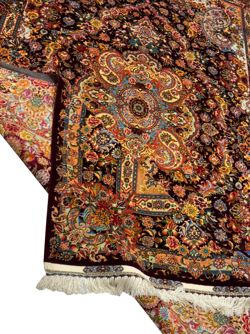 دست بافت تبريز 200*300 مستطيل سالاري 80 رج کرک و ابريشم شرابي شرابي 12 Kg