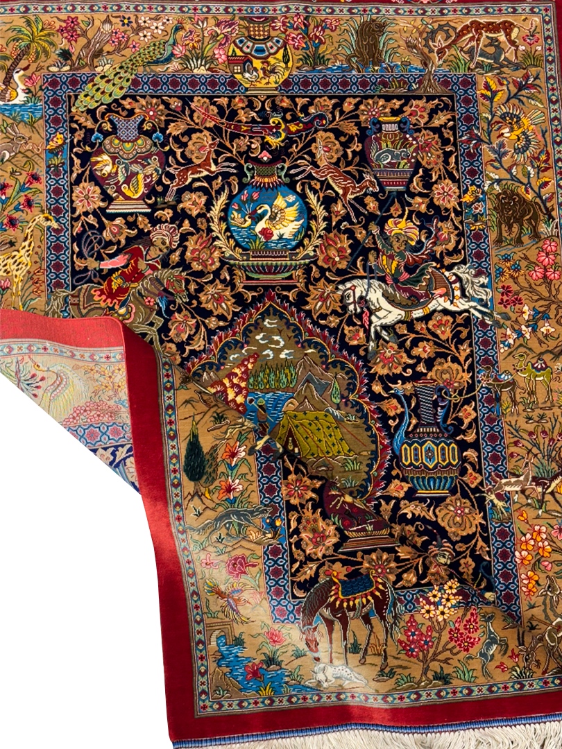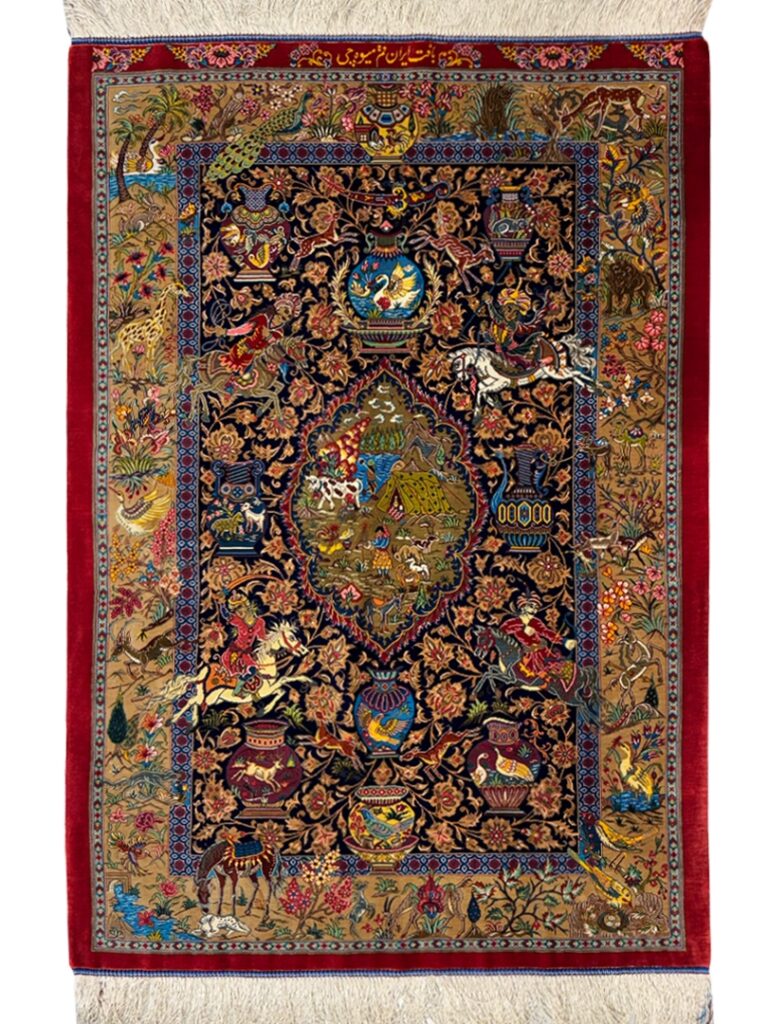 فرش دست بافت مستطیل شکارگاه میوه چی 80 رج تمام ابریشم کد 2003966