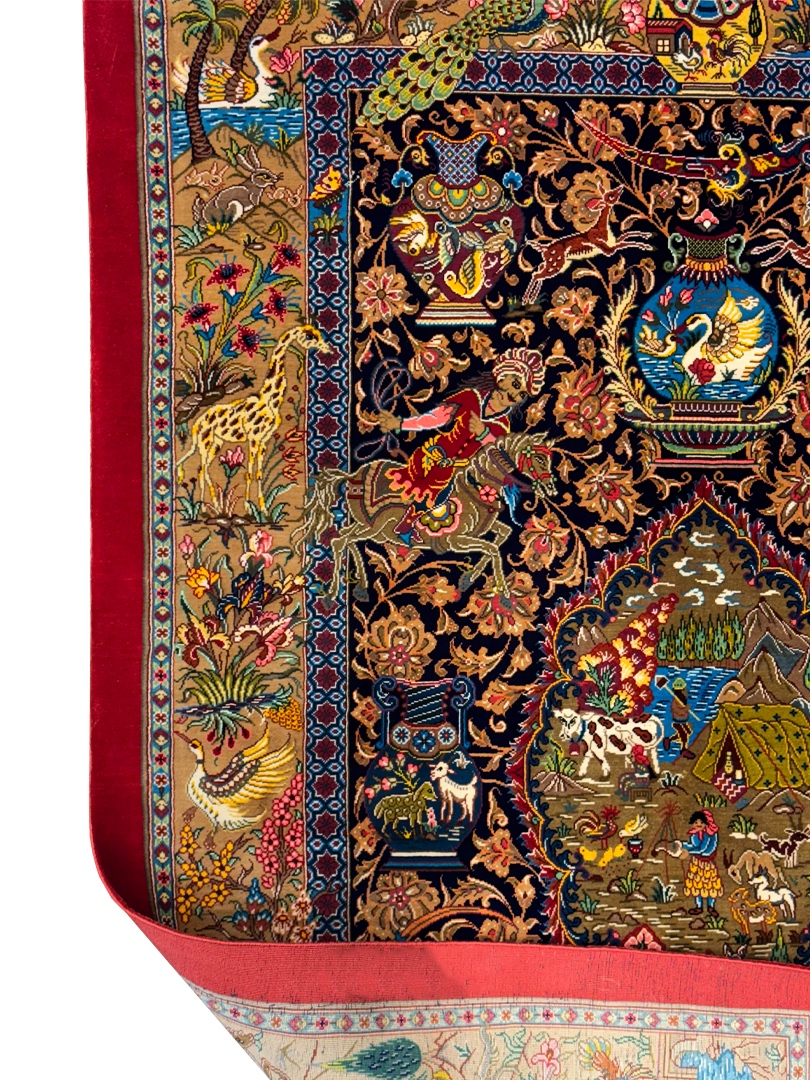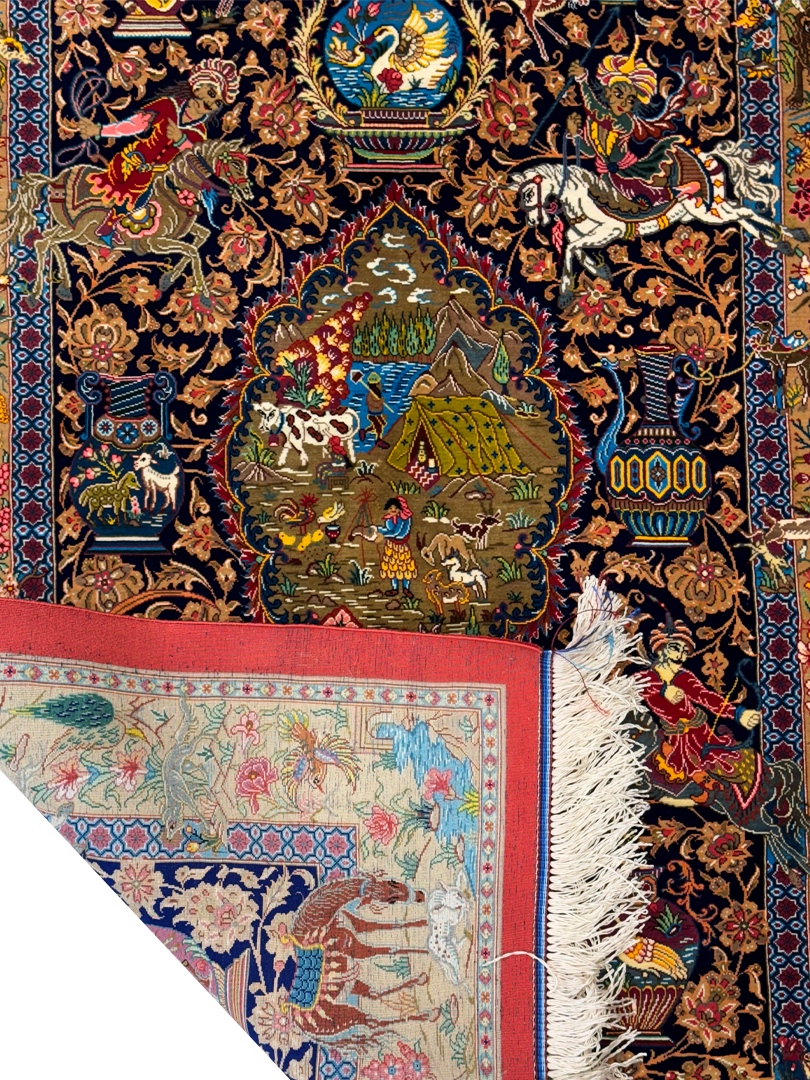 دست بافت قم 80*120 مستطيل شکارگاه ميوه چي 80 رج تمام ابريشم سورمه ايي الوان لاکي الوان kg1 مالکيت شادکام