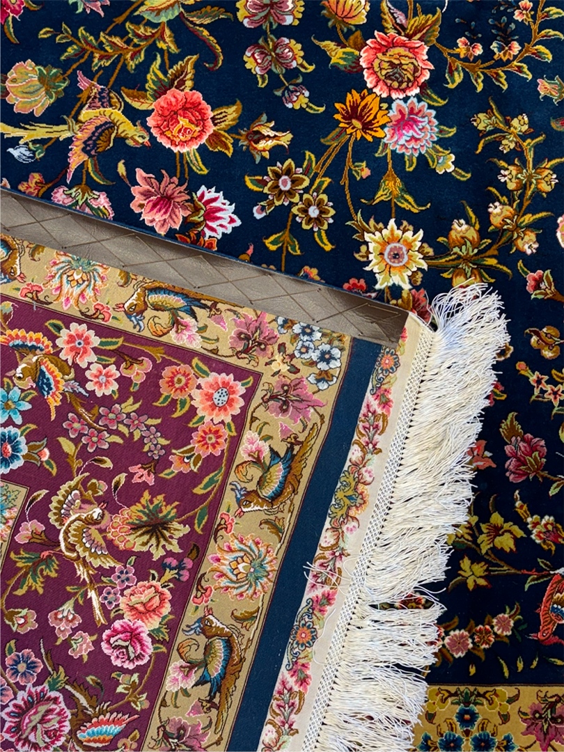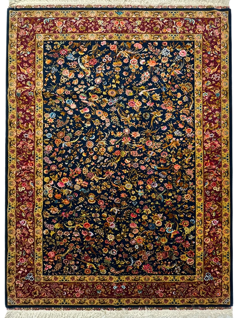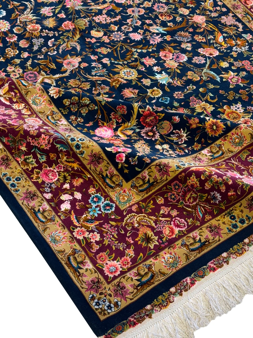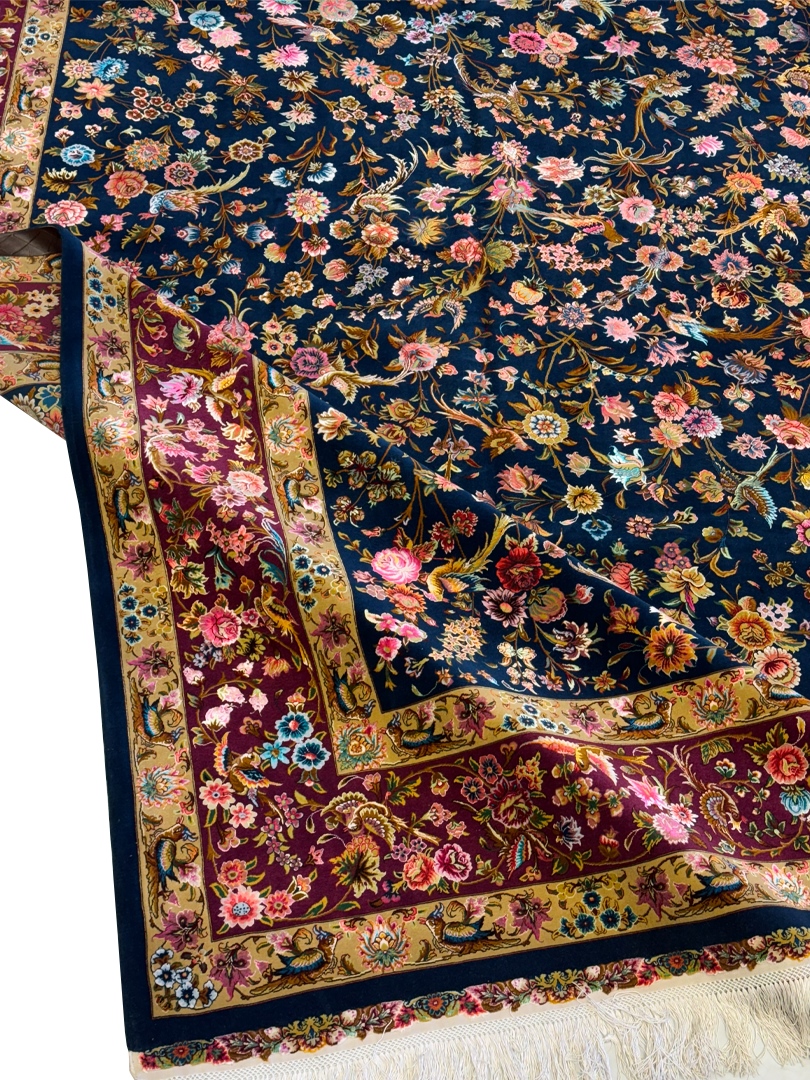 دست بافت تبريز 200*300 مستطيل صادق نژاد 80 رج کرک ابريشم با حاشيه ابريشم سورمه ايي الوان زرشکي 18 Kg