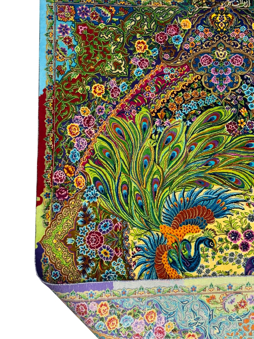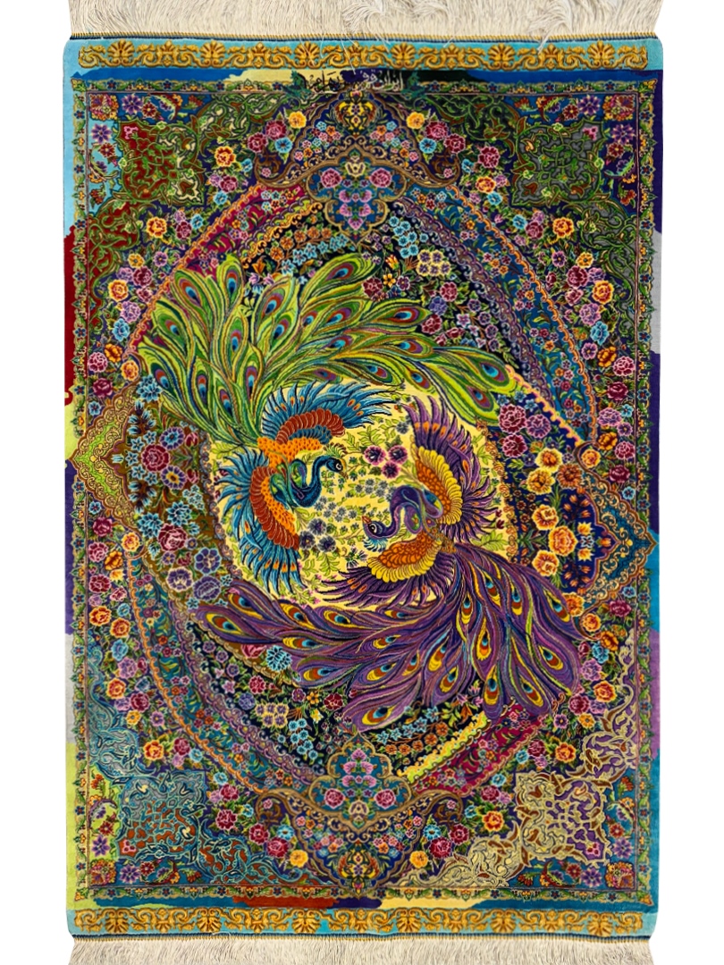 دست بافت قم 80*120 مستطيل طاووسي بهرام 80 رج تمام ابريشم کرم الوان الوان kg1