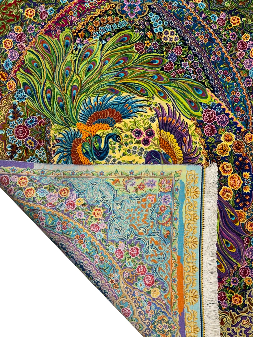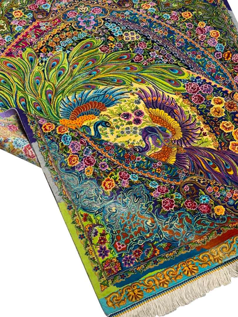 فرش دست بافت مستطیل طاووسی بهرام 80 رج تمام ابریشم کد 2003968