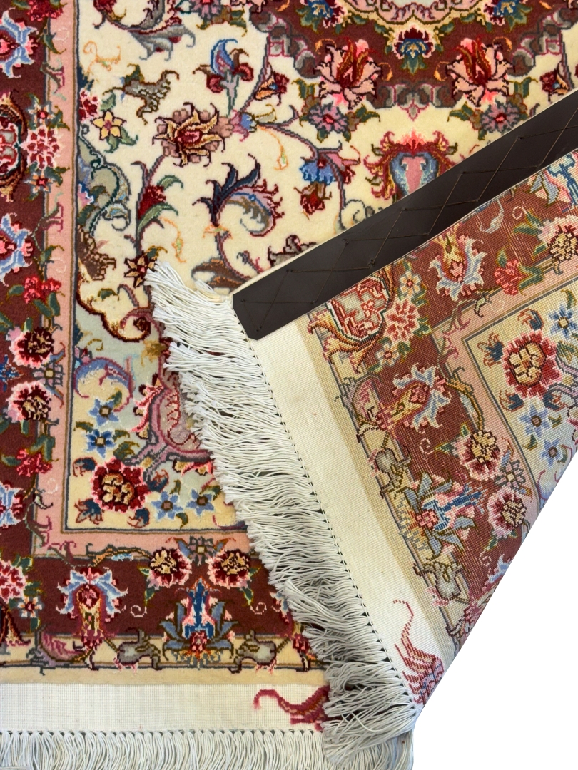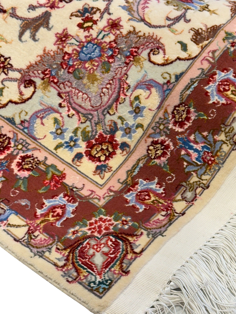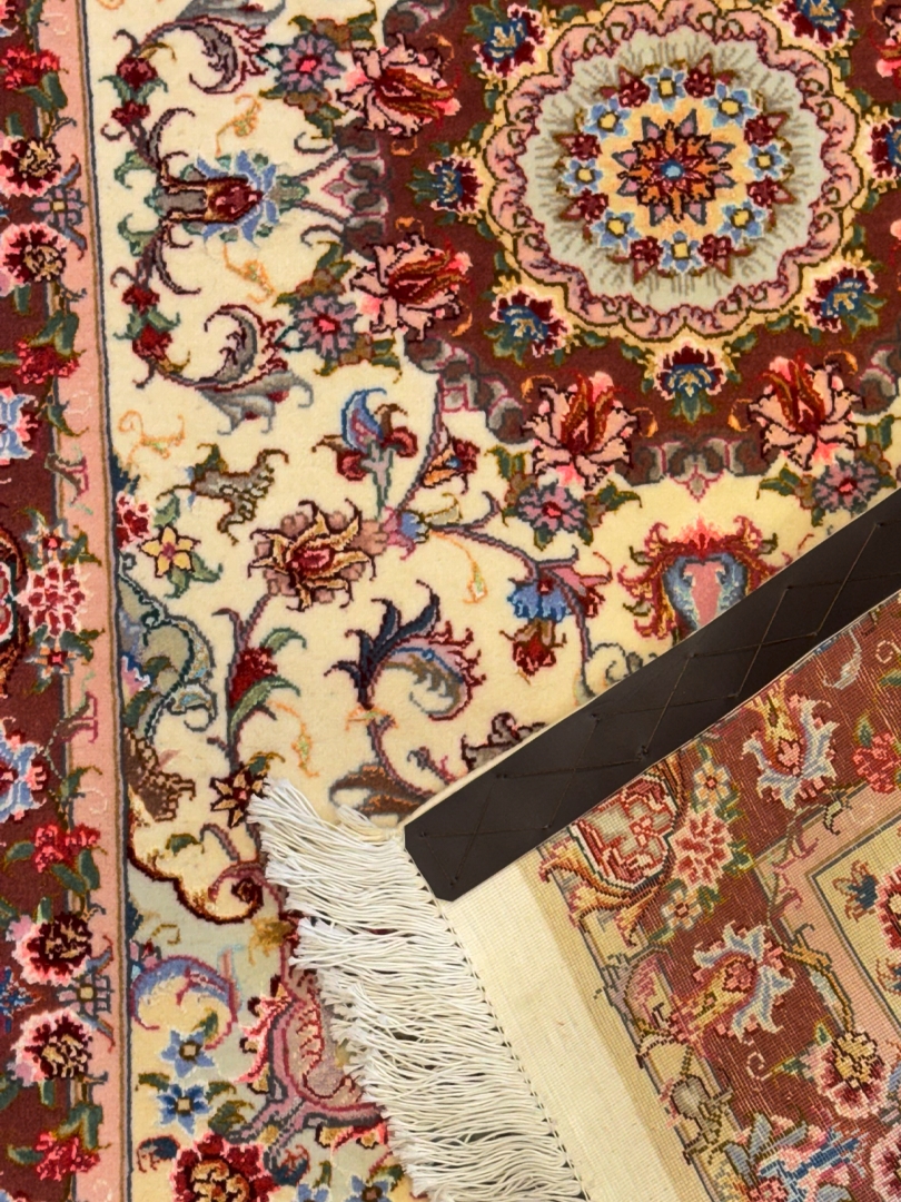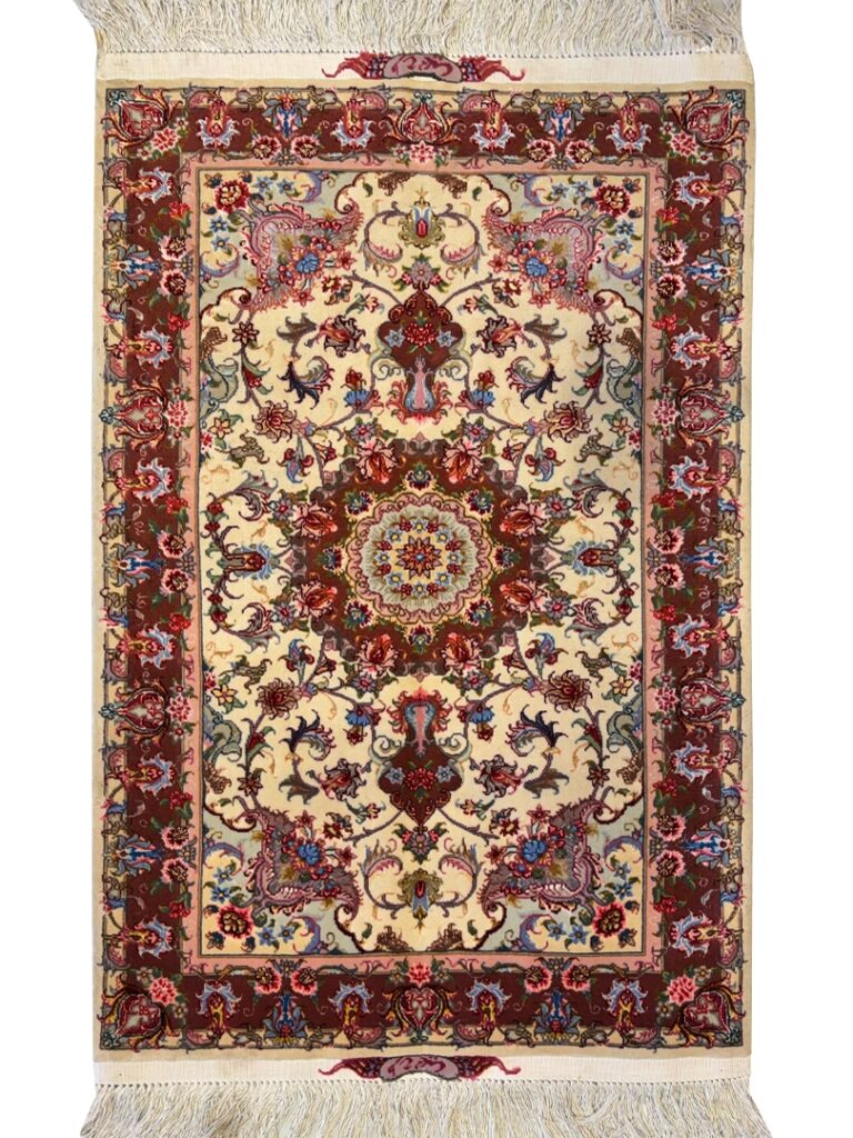 دست بافت تبريز 80*120 مستطيل عليا 50 رج کرک و ابريشم کرم مسي مسي 2 Kg
