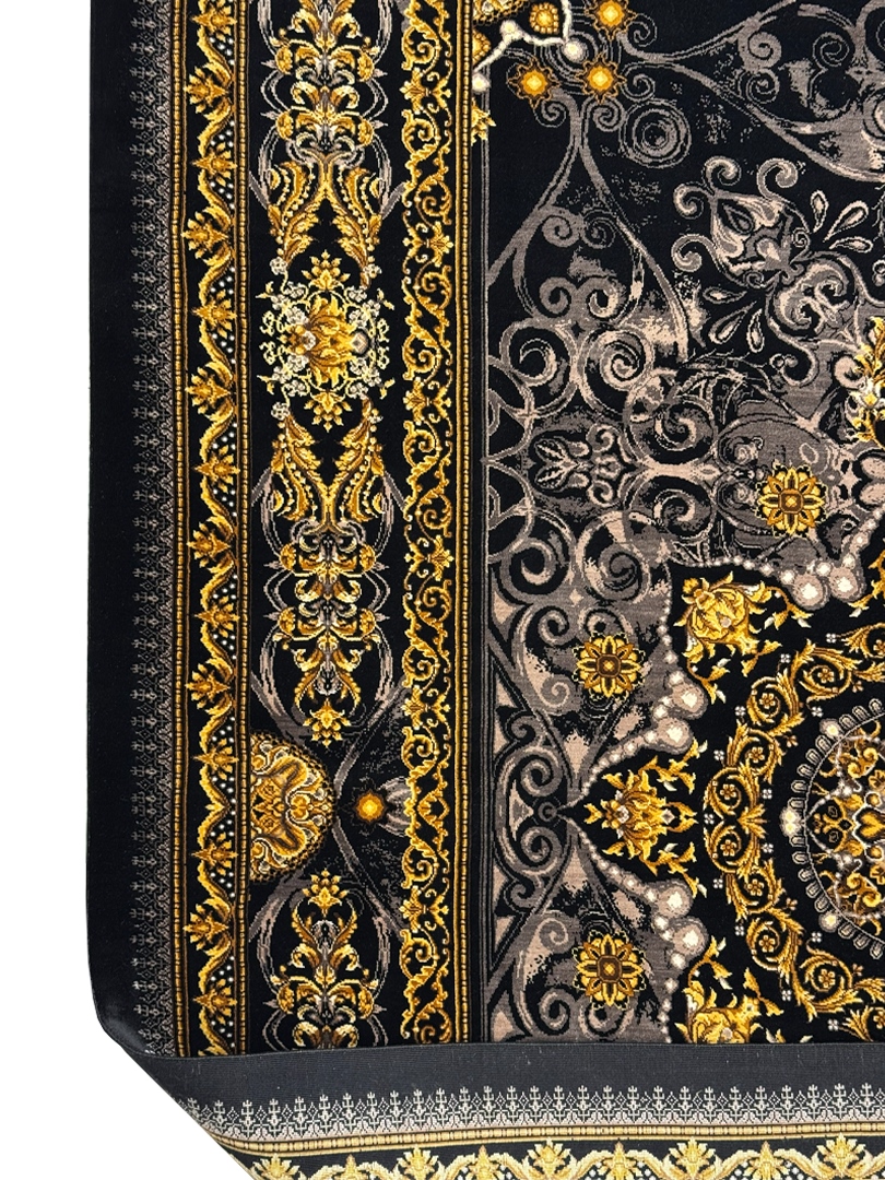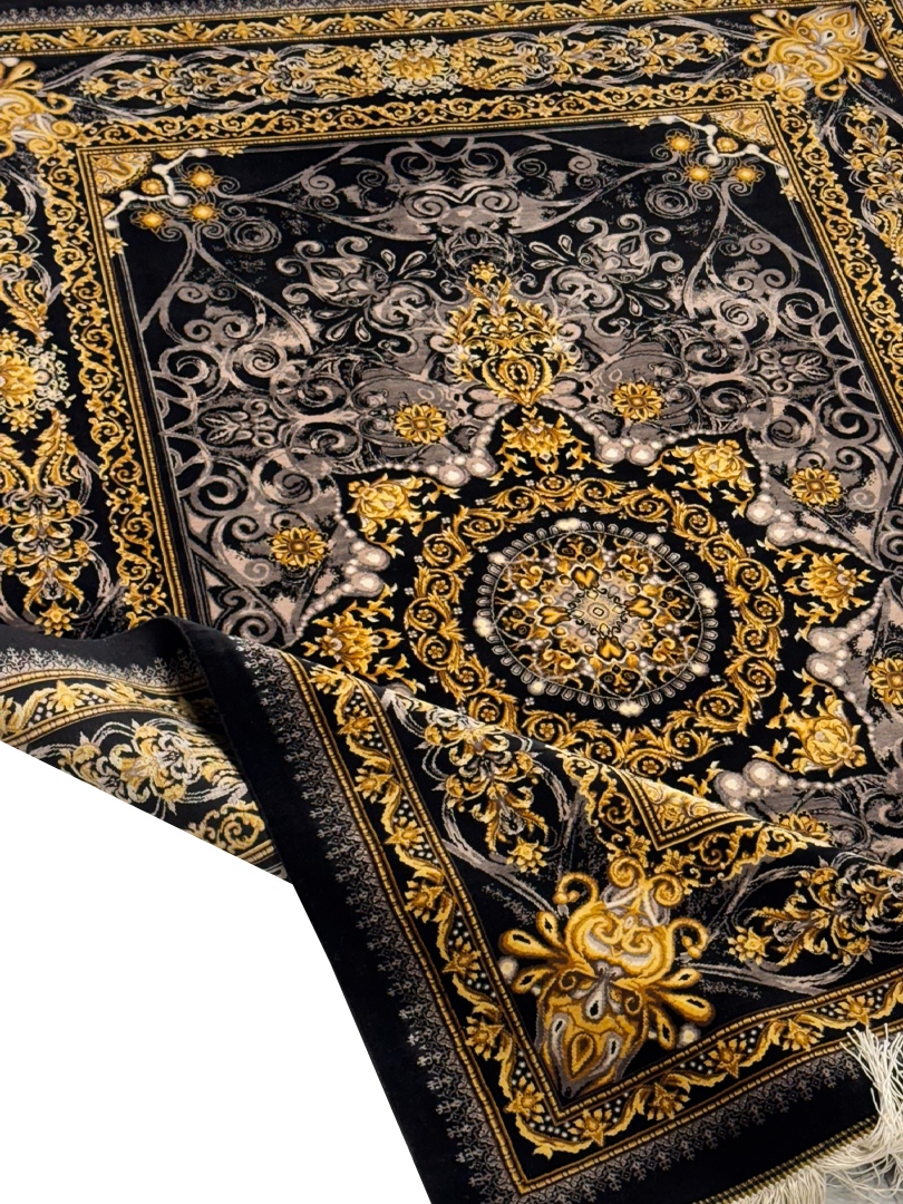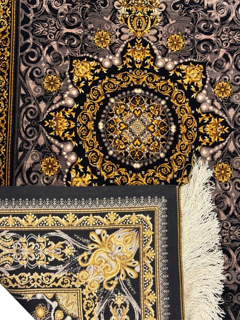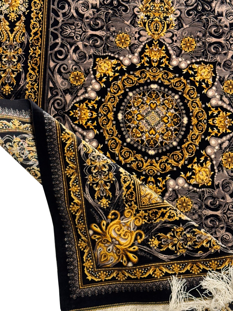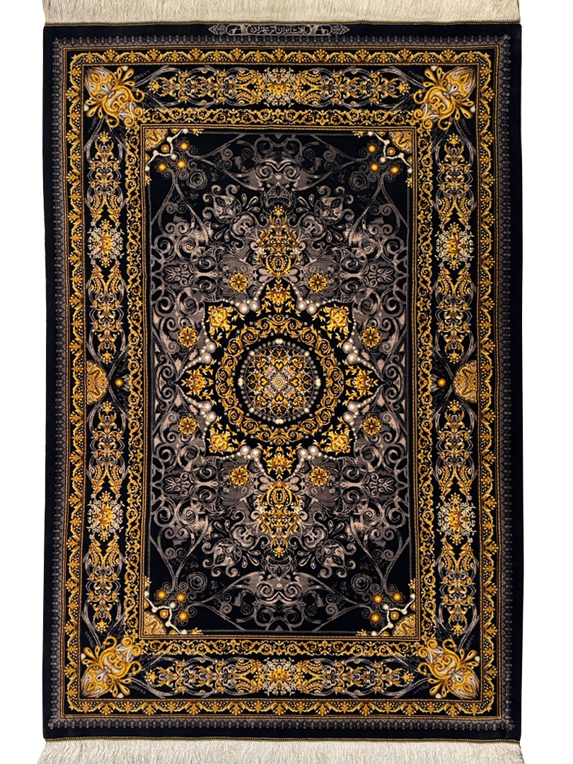دست بافت قم 100*150 مستطيل عليزاده 80 رج تمام ابريشم مشکي طلايي بژ و طلايي 5 Kg