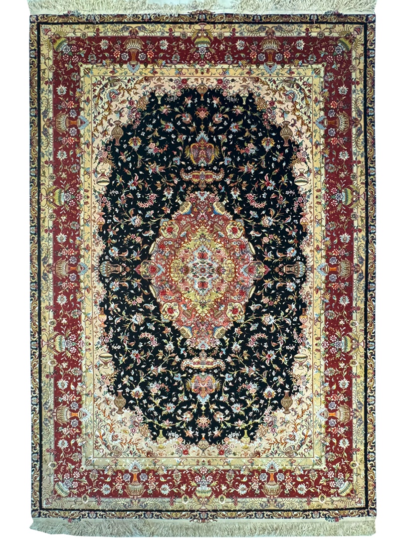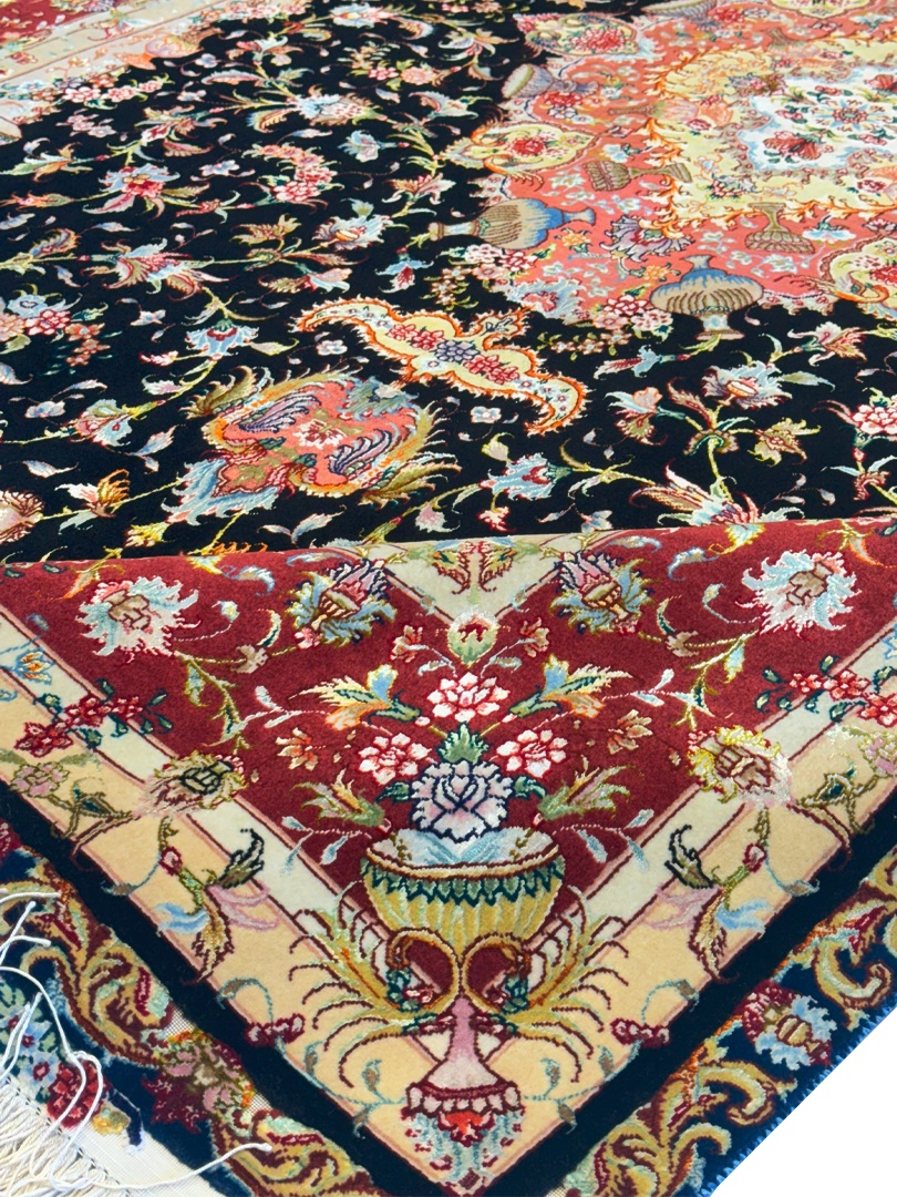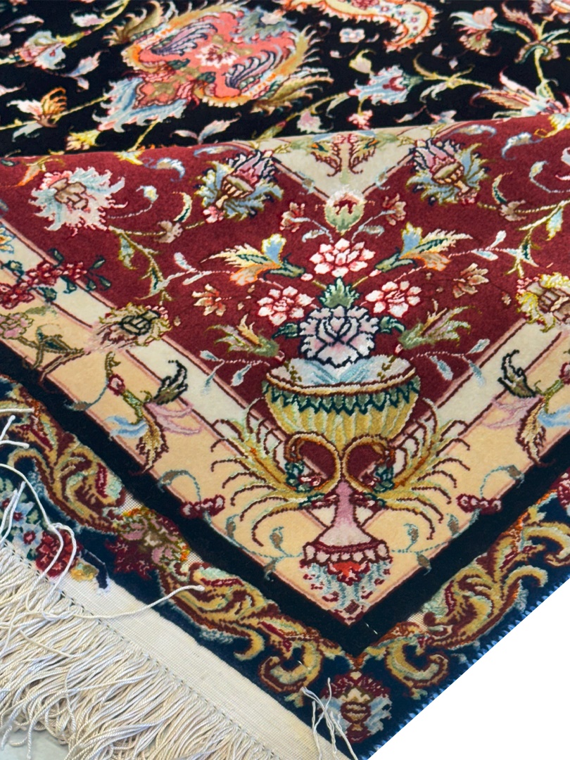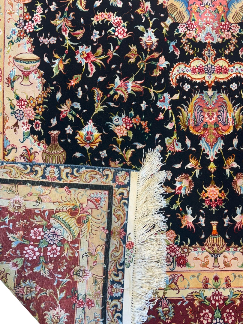 دست بافت تبريز 200*300 مستطيل نشاط 50 رج کرک و ابريشم مشکي صورتي عنابي 18 Kg