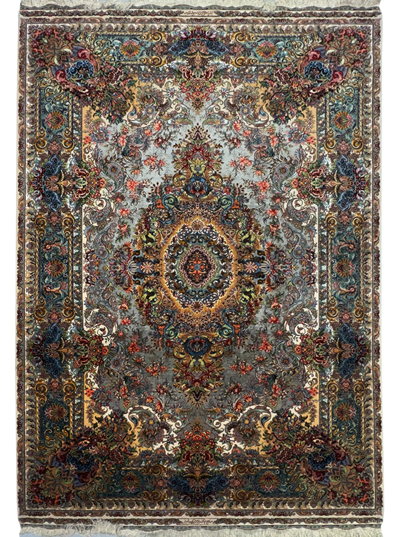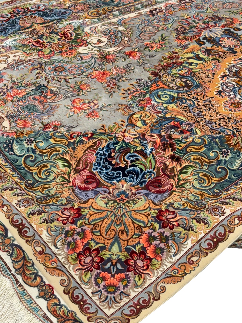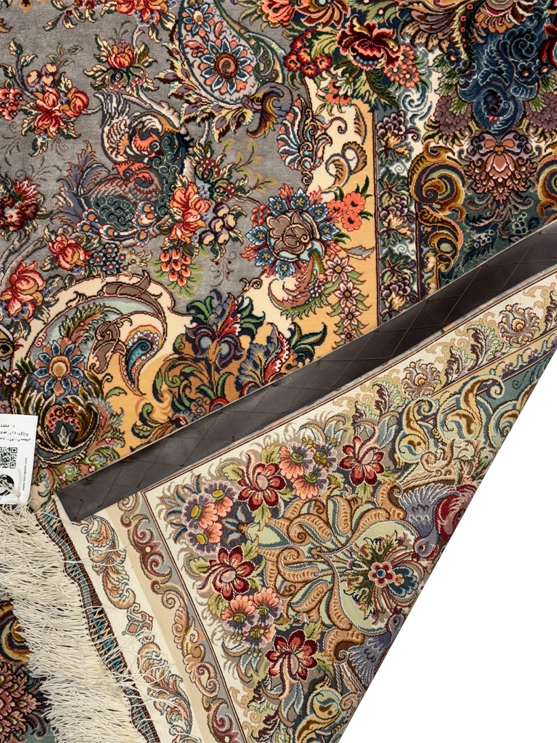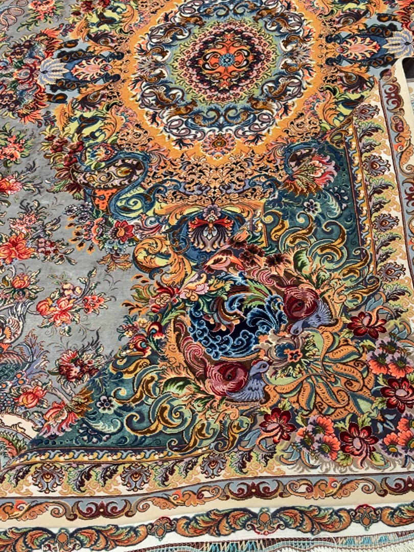 دست بافت تبريز 200*300 مستطيل نوين فر موج مهر 60 رج کرک و ابريشم کرم سبز آبي 20 Kg
