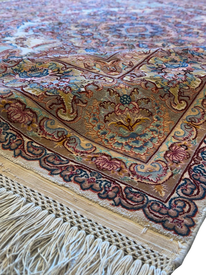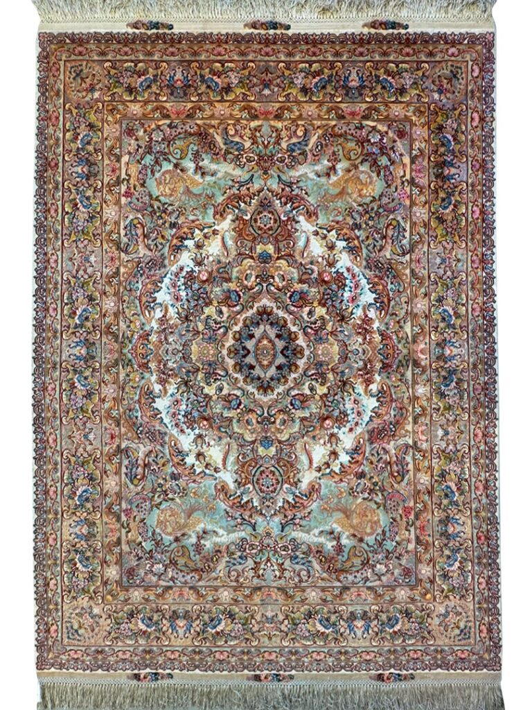 دست بافت تبريز 150*200 مستطيل نوين فر 60 رج کرک و ابريشم کرم طلايي الوان 9 Kg