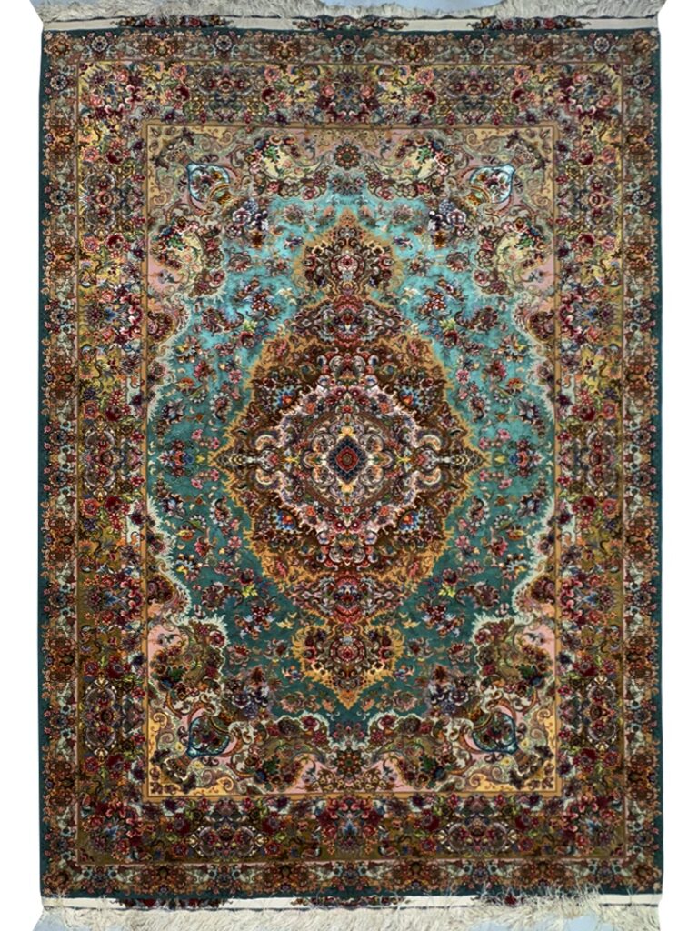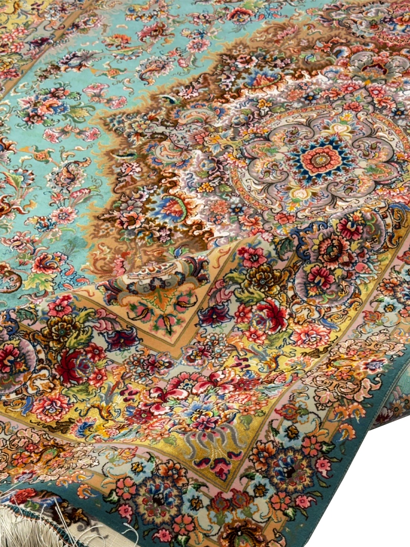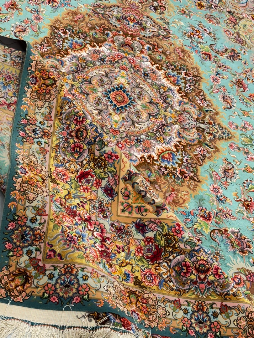 دست بافت تبريز 200*300 مستطيل نوين فر 60 رج کرک و ابريشم کرم ابي فيروزه اي و بژ 20 Kg
