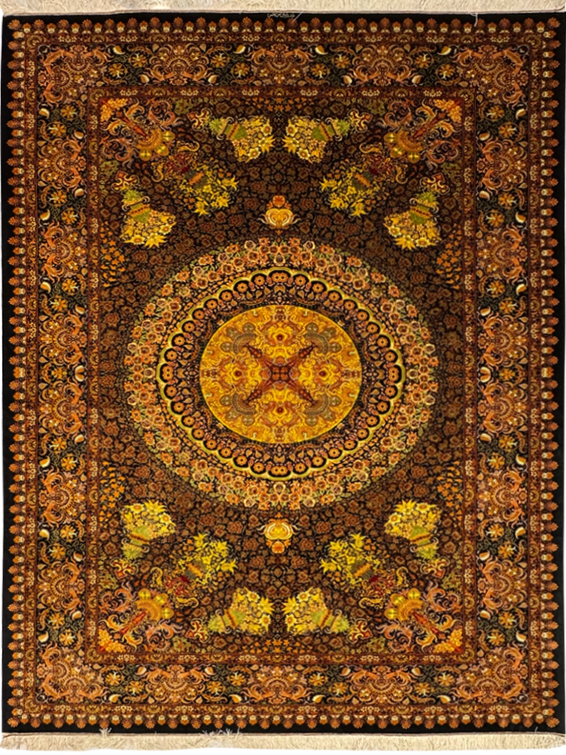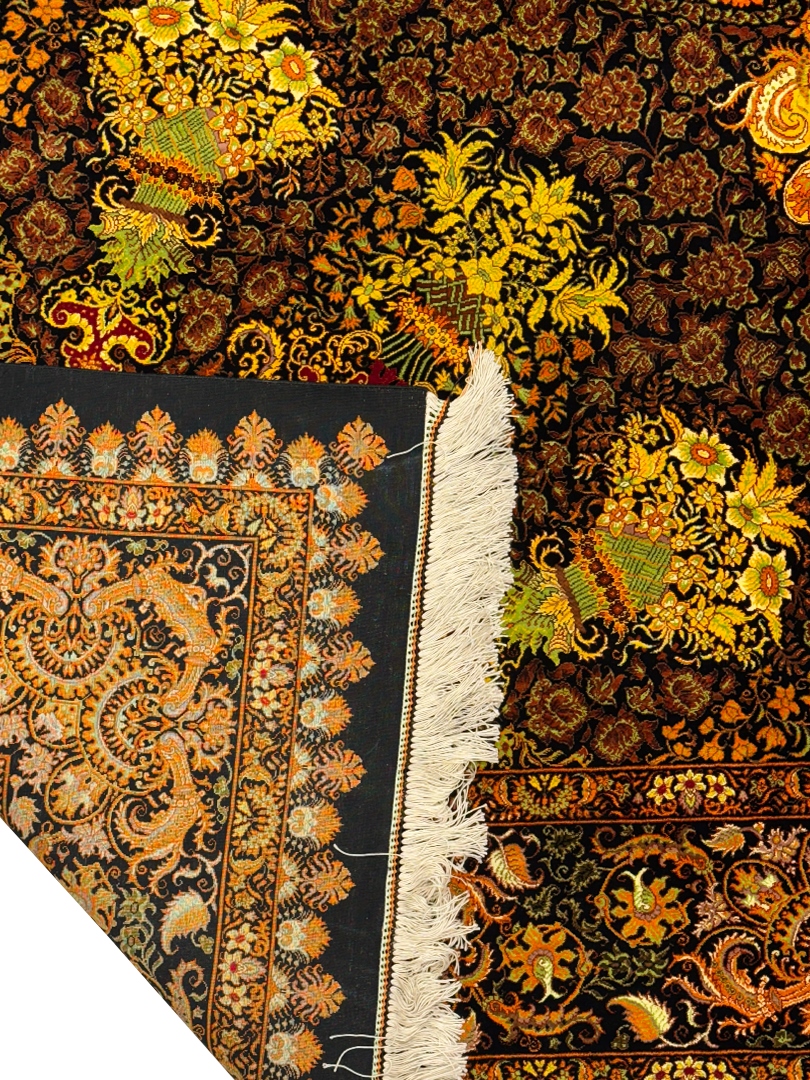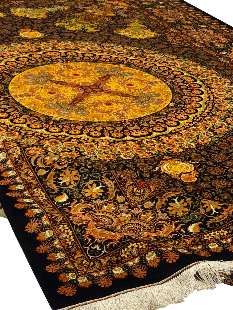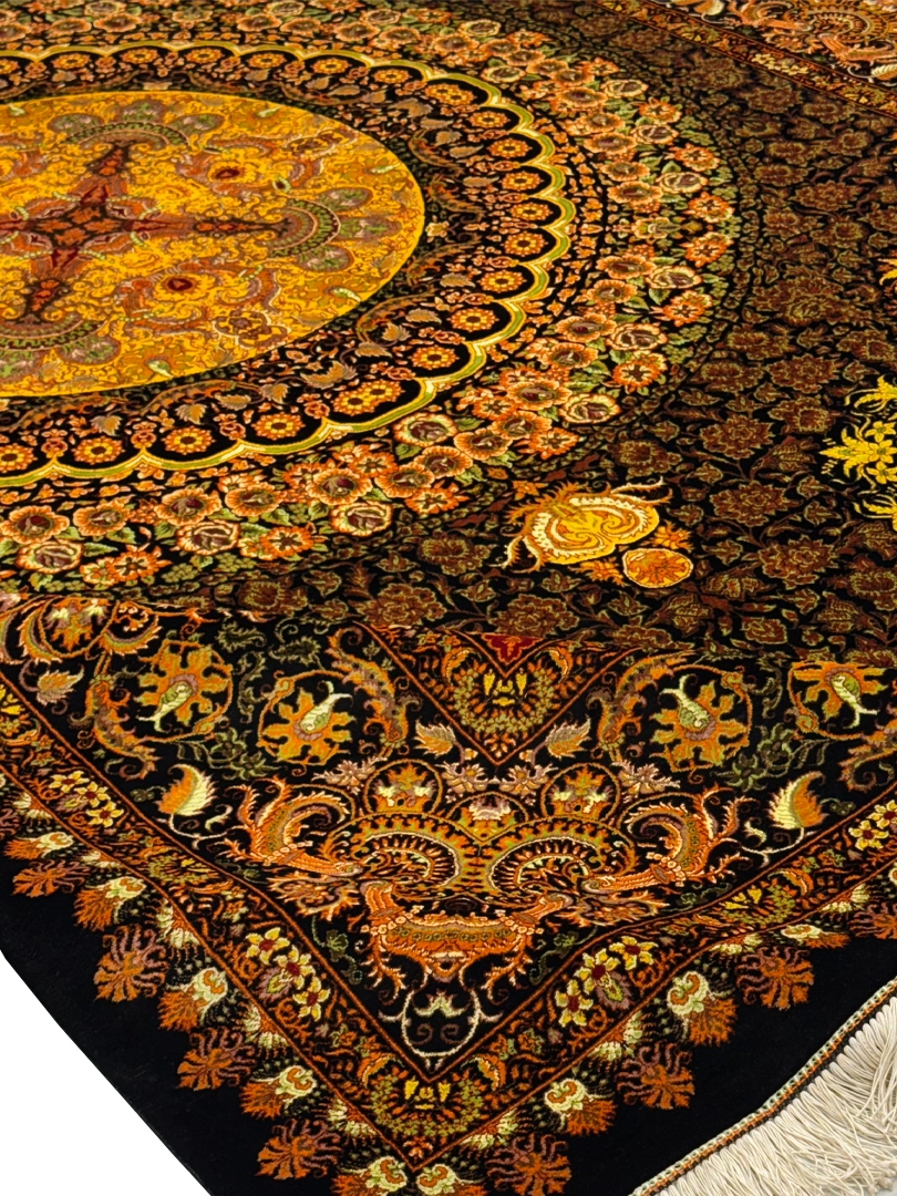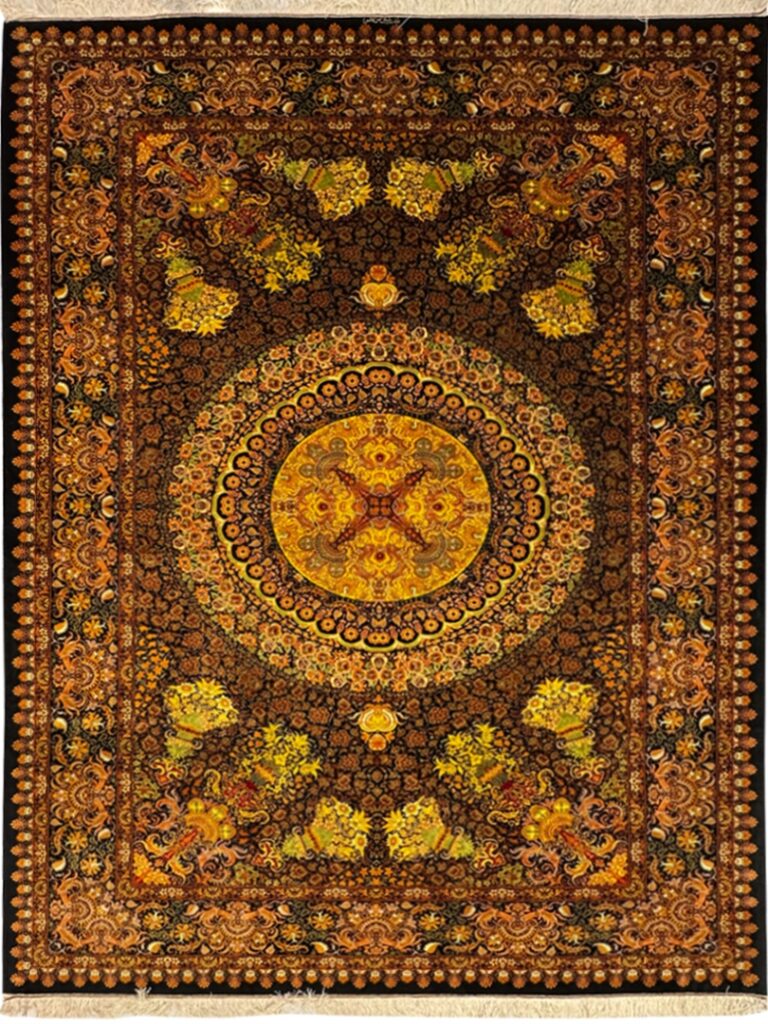 دست بافت قم 200*300 مستطيل کاظمي 70 رج تمام ابريشم مشکي طلايي مشکي طلايي 6 Kg
