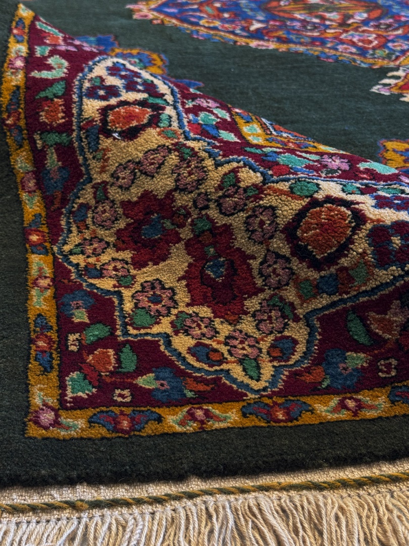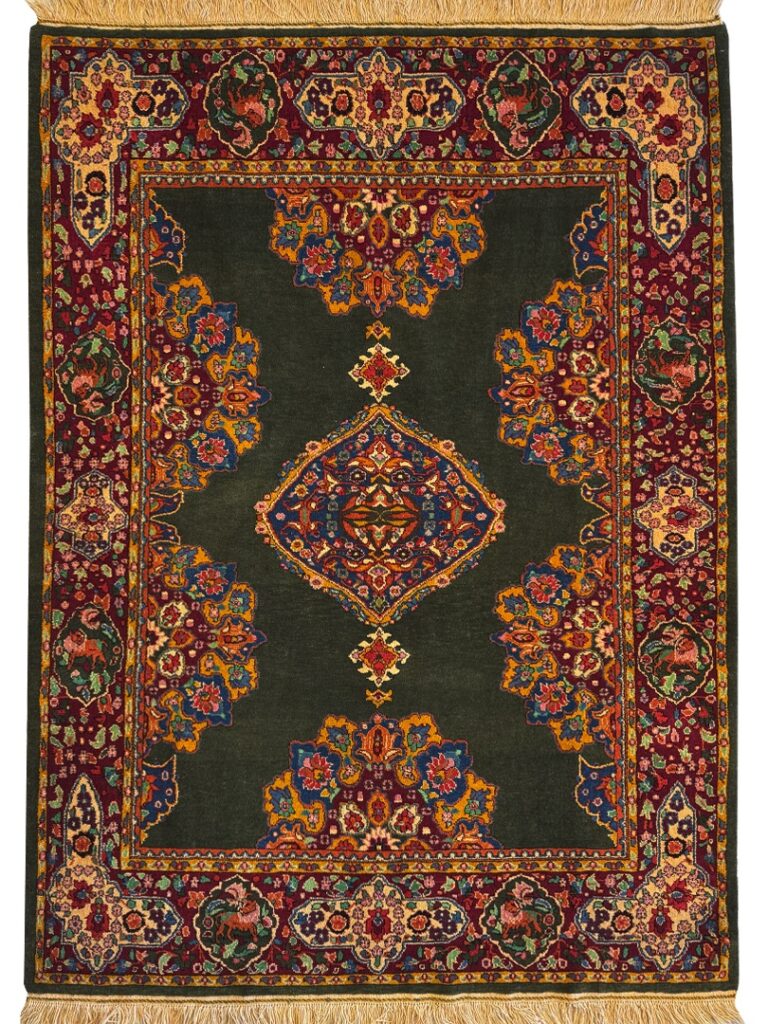 دست بافت عشايري 150*200 مستطيل کف ساده کرمان لچک وسط 40 رج پشم طبيعي سبز شرابي 12 Kg