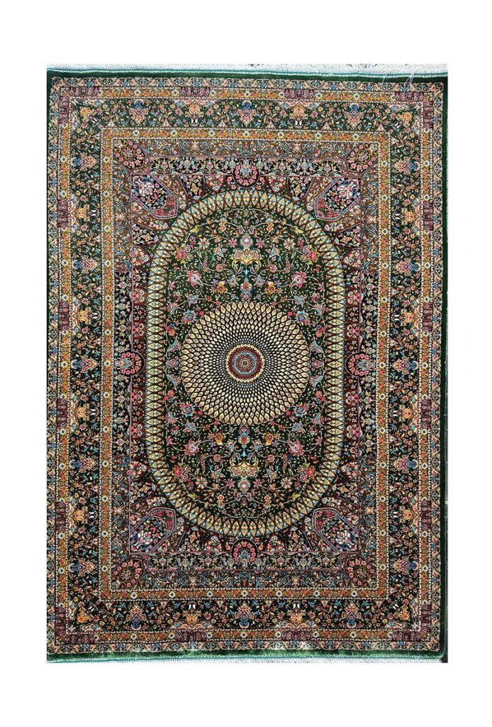 ربات بافت قم 100*150 مستطيل اسليمي 70 رج ابريشم و بنبوسيلک سبز کرم و سبز 3 Kg