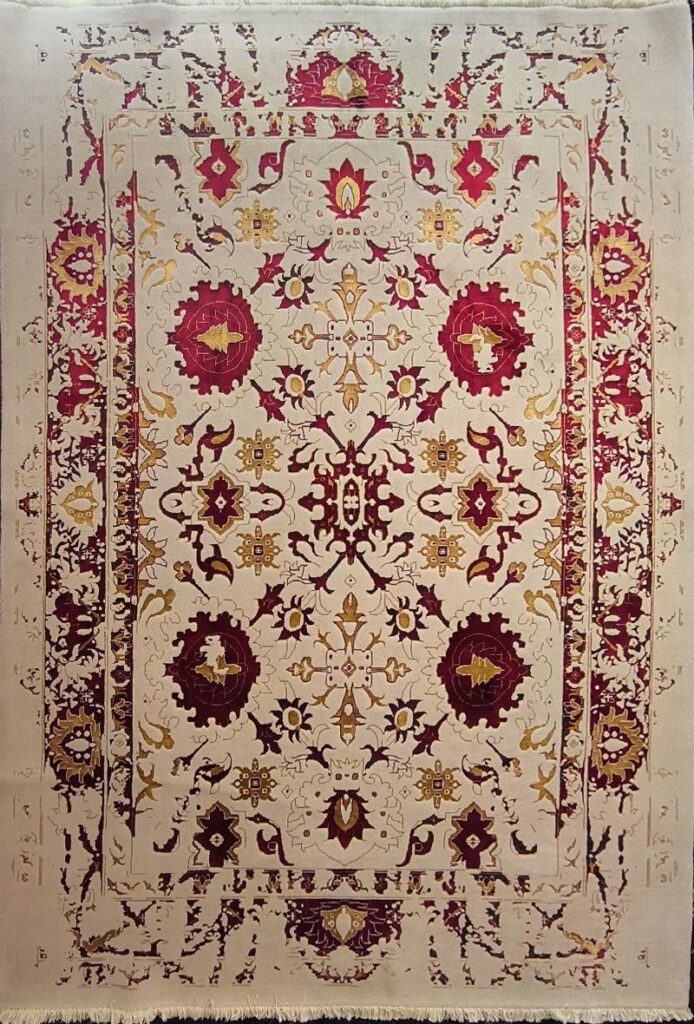 ربات بافت پشم 200*300 مستطيل افشان امريکايي پتينه کاري 30 رج پشم و بنبوسيلک طوسي شرابي طلايي طوسي 25 Kg