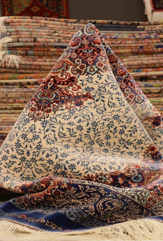 ربات بافت قم 120*180 مستطيل افشان 70 ابريشم و بنبوسيلک کرم آبي 12 Kg فرش شادکام