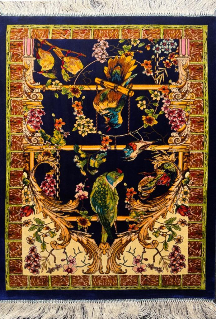 ربات بافت قم 60 * 90 مستطيل باغ طوطي 70 رج ابريشم و بنبوسيلک سورمه‌اي سورمه ايي Kg 1