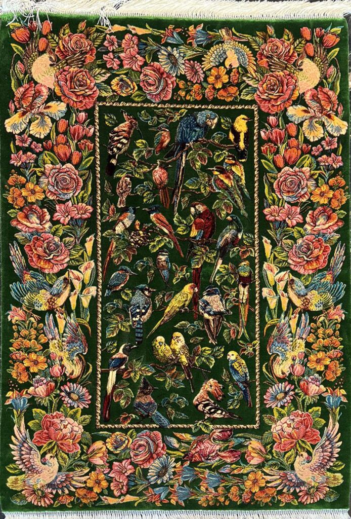 ربات بافت قم 80*120 مستطيل باغ پرندگان 70 رج ابريشم و بنبوسيلک سبز سبز 2 Kg