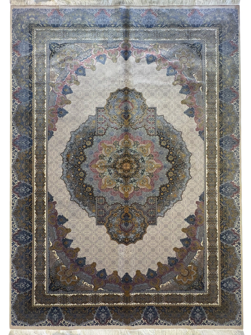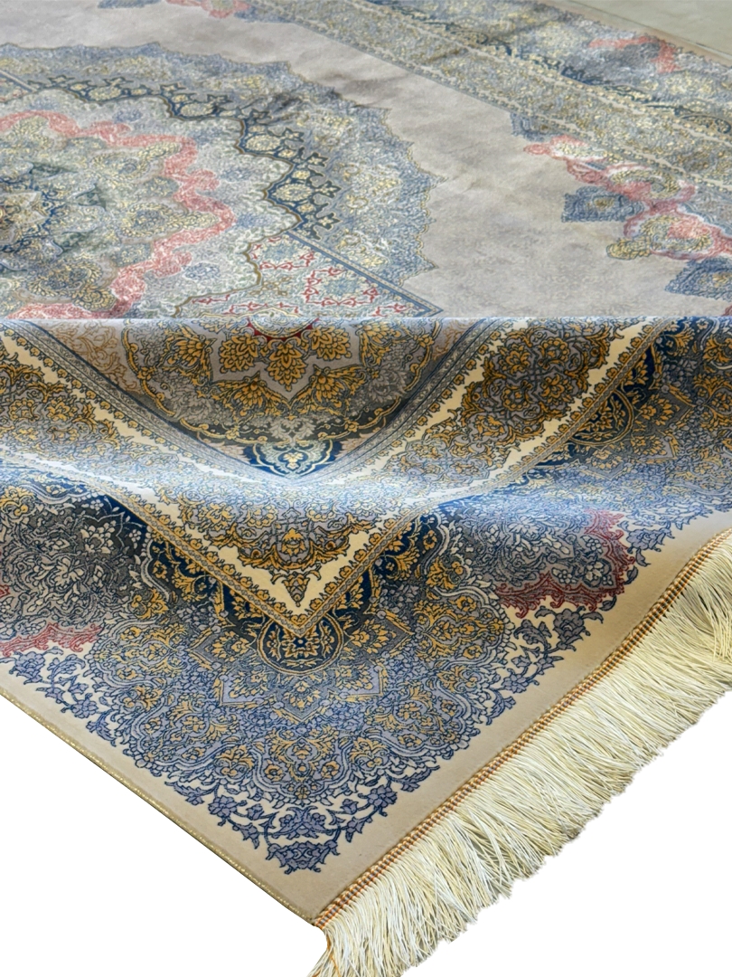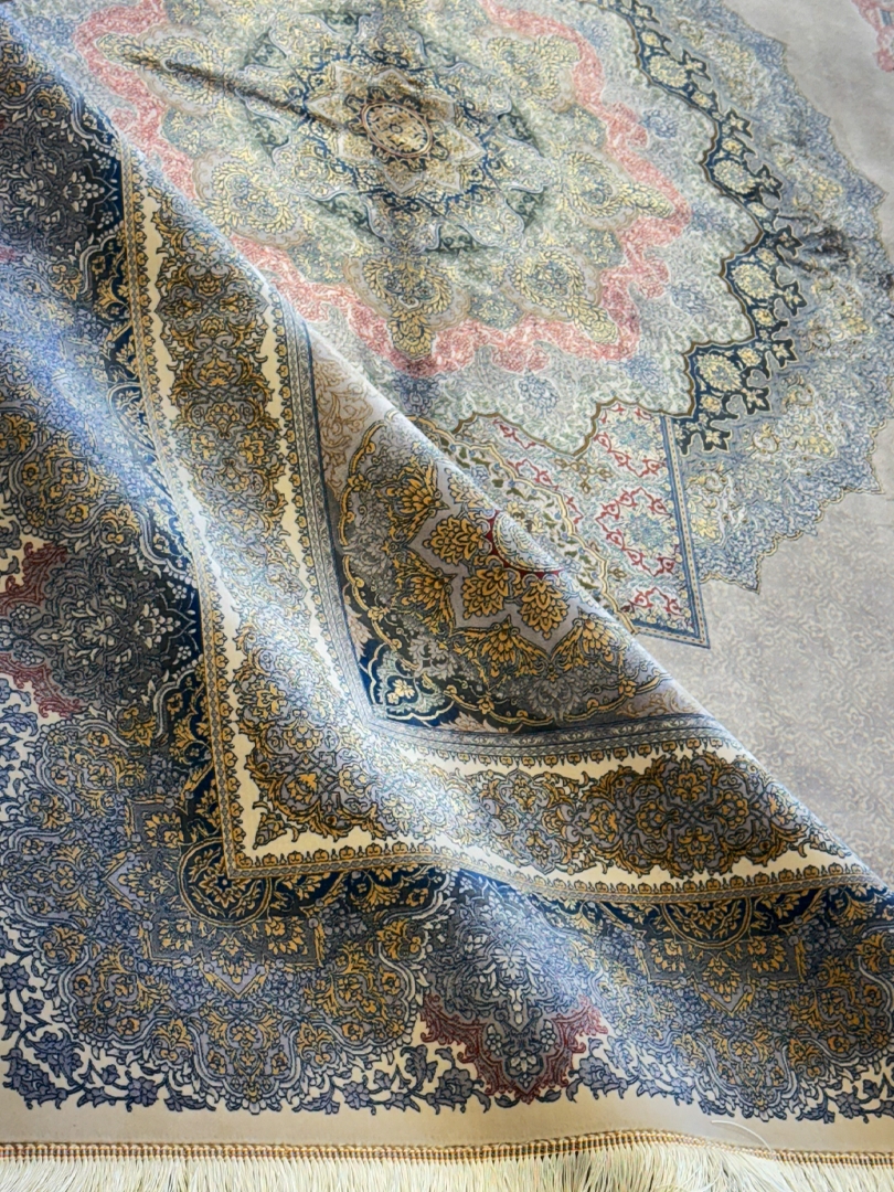 ربات بافت تمام ابريشم 2 نخ 200*300 مستطيل لچک ترنجي محو بافي 70 رج کرک و بمبوسيلک طوسي الوان طوسي و طلايي 25 Kg