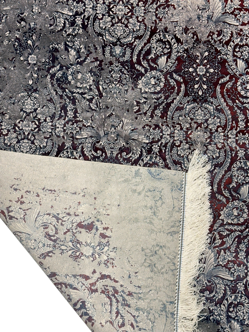 ربات بافت تمام ابريشم 2 نخ 150*225 مستطيل پتينه مدرن 70 رج بنبوسيلک و پشم عنابي طوسي کرم طوسي 6 Kg
