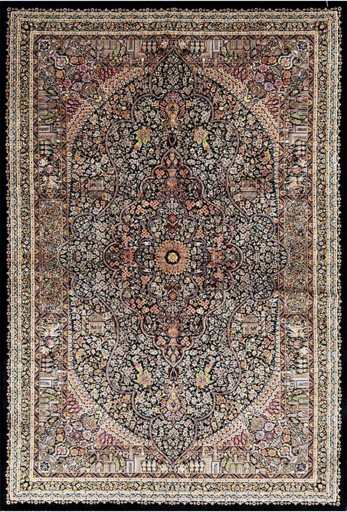 ربات بافت قم 80*120 مستطيل جمشيدي 70 رج ابريشم و بنبوسيلک الوان مشکي2 Kg