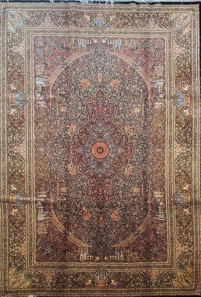 ربات بافت قم 120*180 مستطيل جمشيدي 70 رج ابريشم و بنبوسيلک مشکي طلايي مشکي 6 Kg