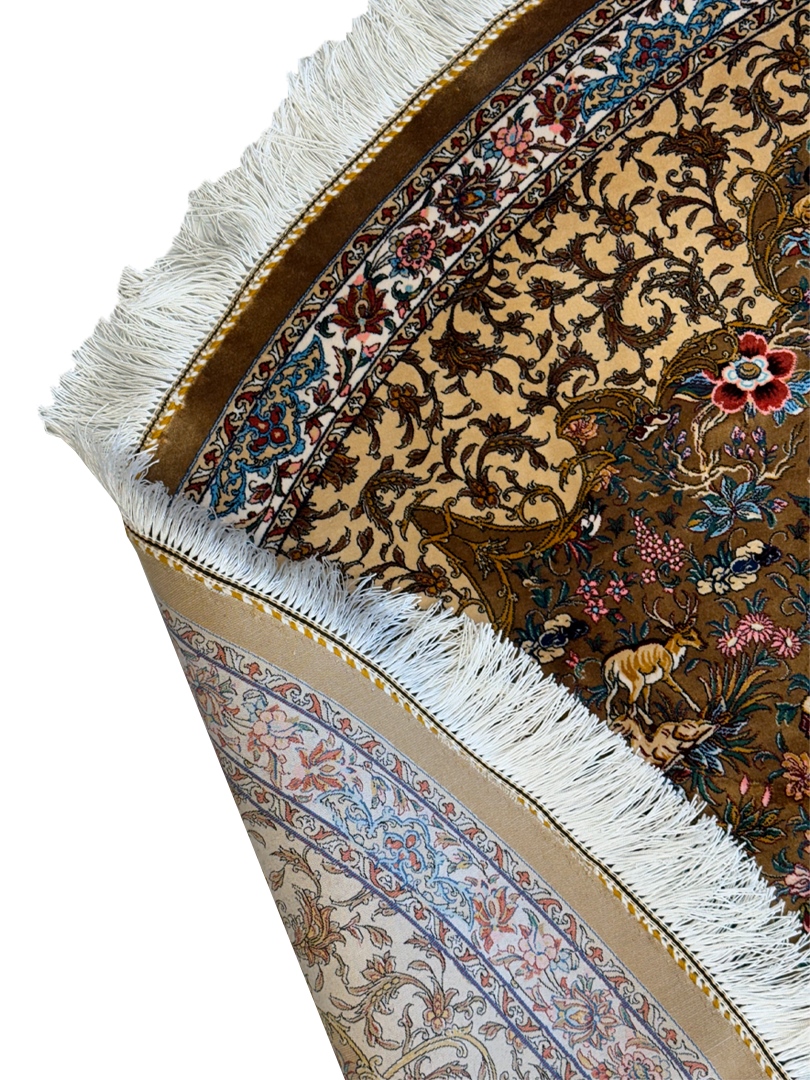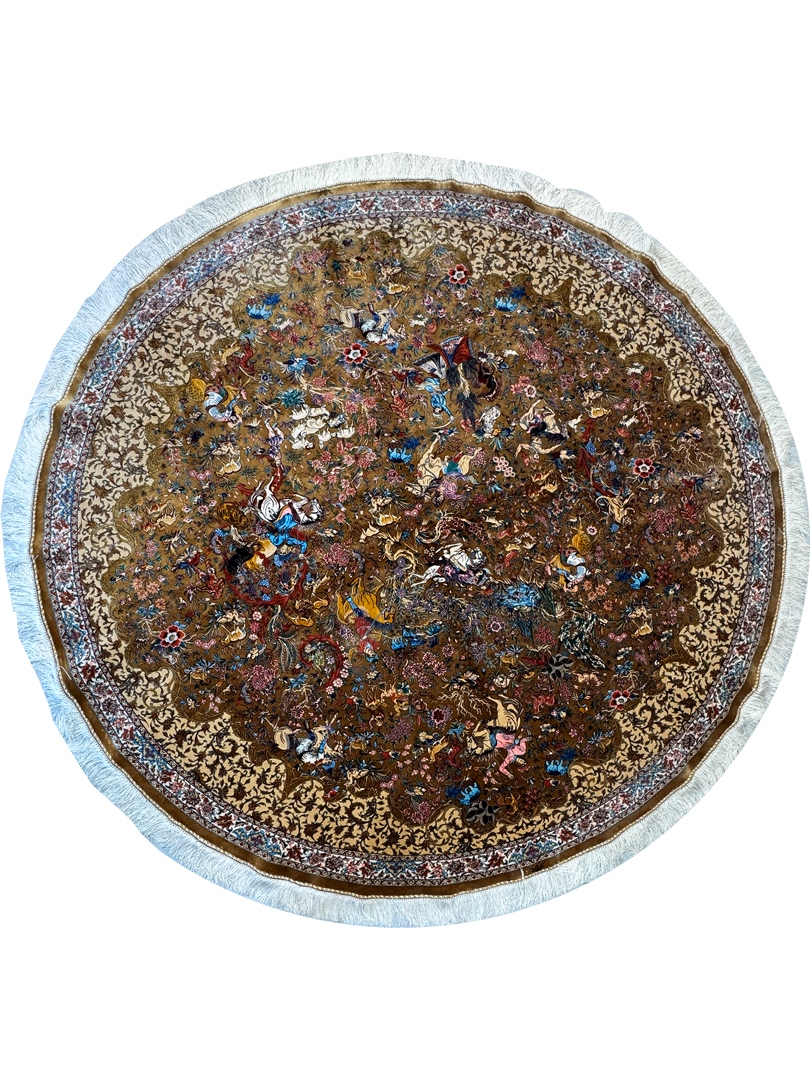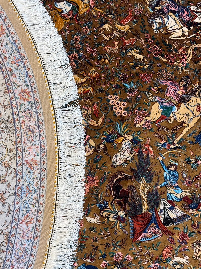 ربات بافت قم 200*200 دايره شکارگاه بهرام 70 رج ابريشم و بنبوسيلک کرم دارچيني کرم الوان 5 Kg