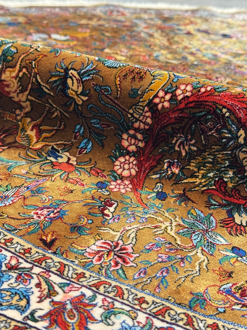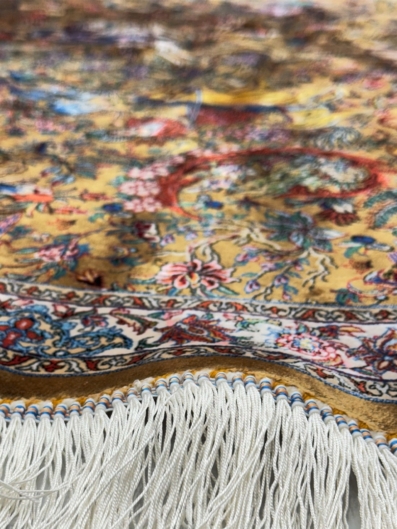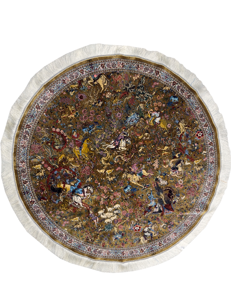 ربات بافت قم 150*150 دايره شکارگاه 70 رج ابريشم و بنبوسيلک قهوهاي قهوهاي 6 Kg