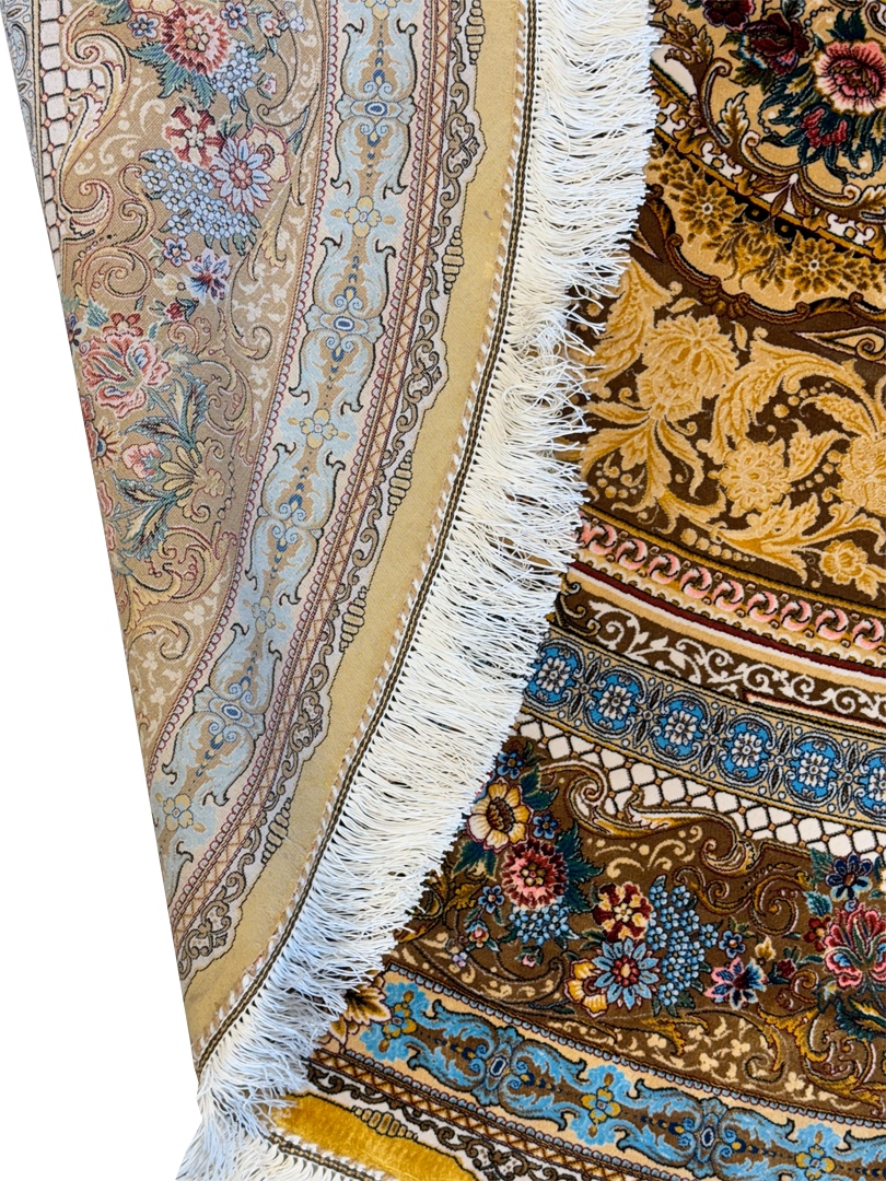 ربات بافت قم 200*200 دايره گلابتون 70 رج ابريشم و بنبوسيلک کرم دارچيني الوان 5 Kg