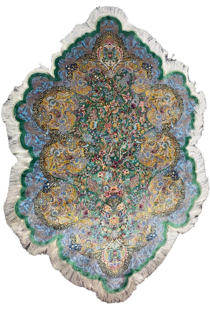 ربات بافت قم 220*150 بيضي درخت زندگي 70 رج ابريشم و بنبوسيلک سبز سبز آبي 8 Kg