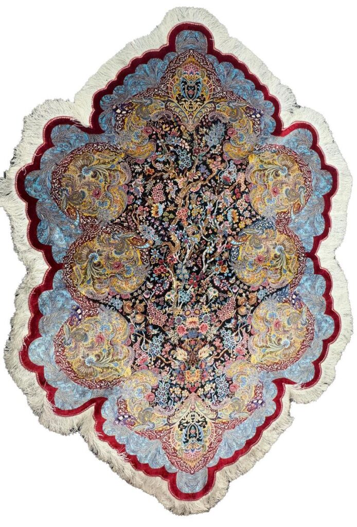 ربات بافت قم 220*150 بيضي درخت زندگي 70 رج ابريشم و بنبوسيلک مشکي شرابي 8 Kg