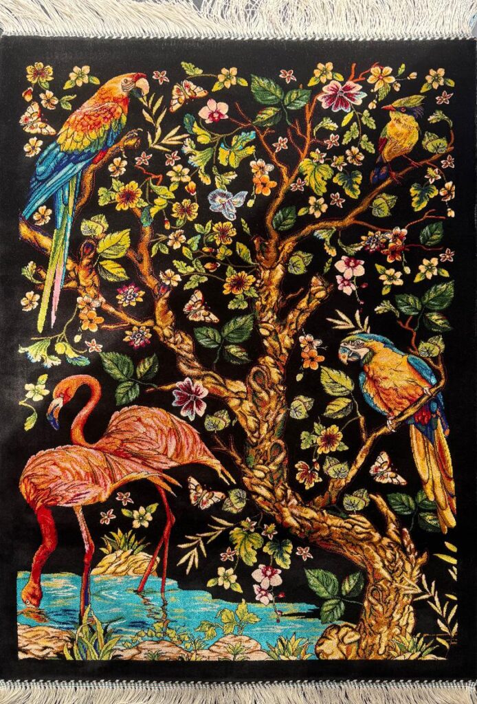 ربات بافت قم 60 * 90 مستطيل درخت زندگي 70 رج ابريشم و بنبوسيلک مشکي مشکي Kg 1