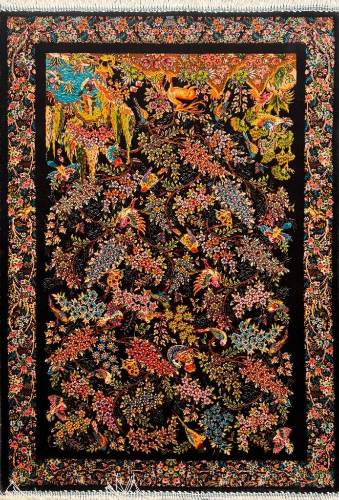ربات بافت قم 60 * 90 مستطيل درخت زندگي 70 رج ابريشم و بنبوسيلک مشکي الوان مشکي Kg 1