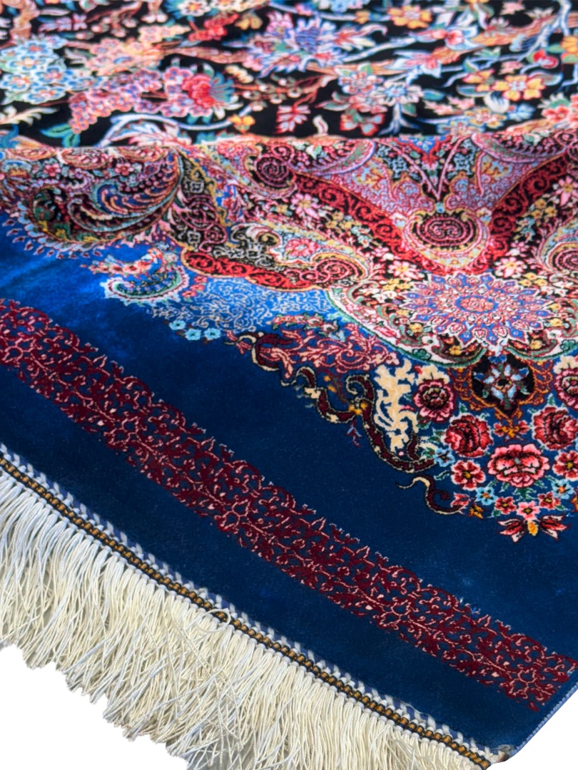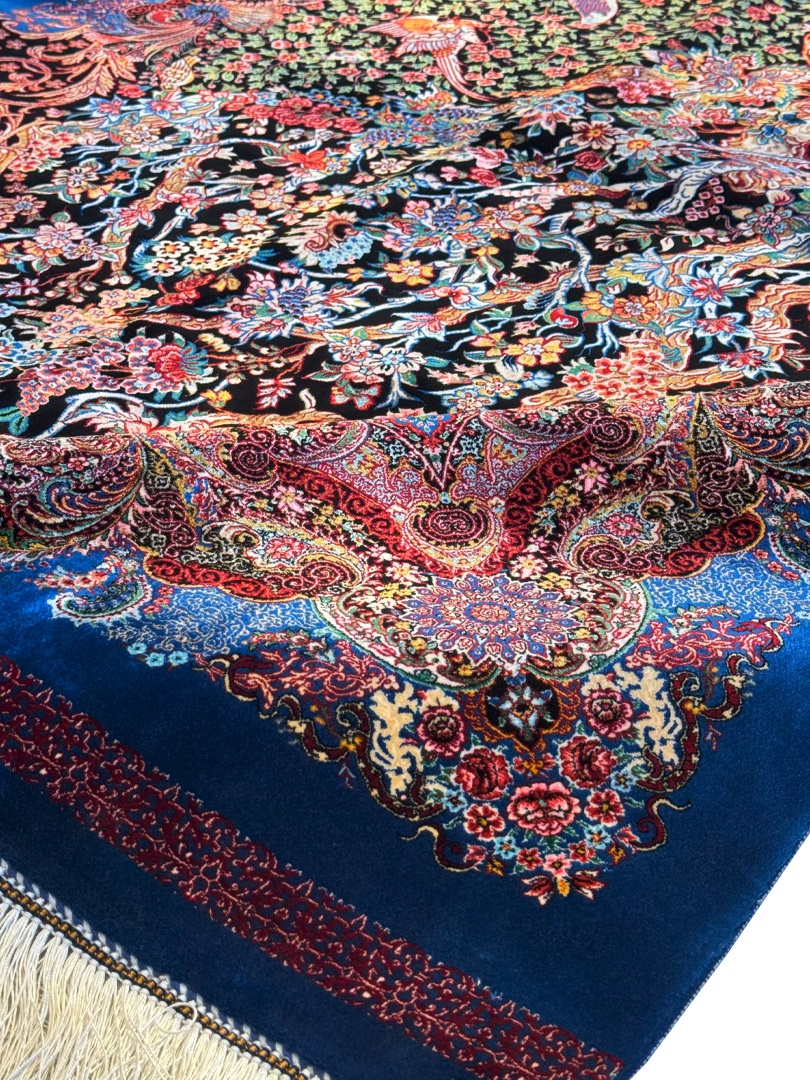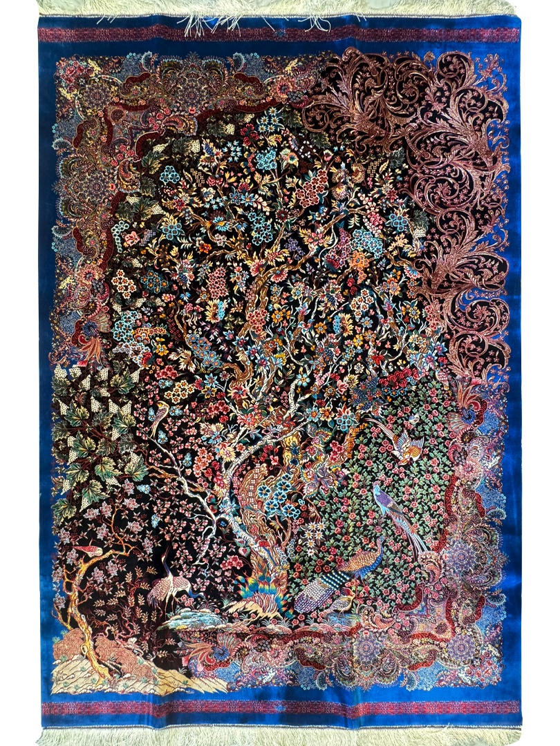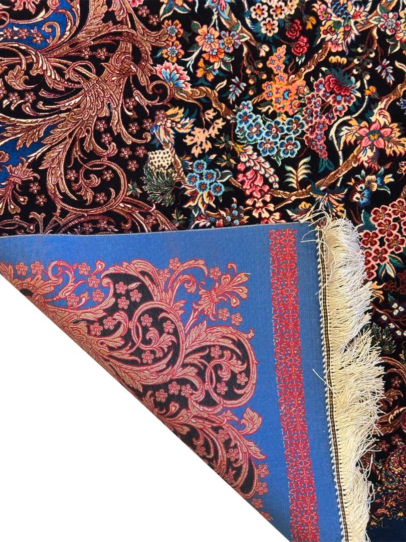 ربات بافت قم 130*200 مستطيل درخت زندگي 70 رج ابريشم و بنبوسيلک مشکي صورتي سورمهاي 6 Kg