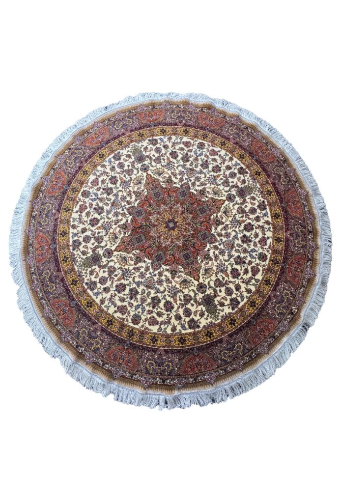 ربات بافت قم 200*200 دايره لچک ترنجي -شاه عباسي 70 رج ابريشم و بنبوسيلک کرم و بژ بژ 4 Kg
