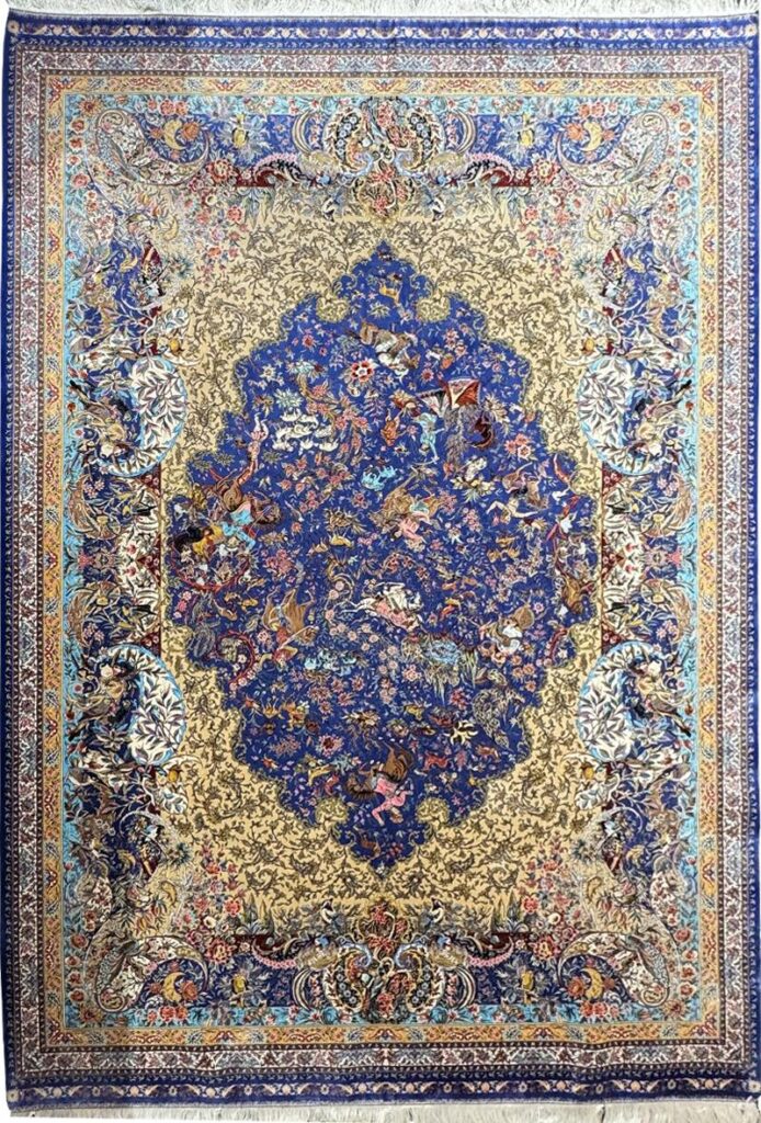 ربات بافت قم 200*300 مستطيل شکارگاه 70 ابريشم و بنبوسيلک کرم و آبي آبي تيره 17 Kg شادکام
