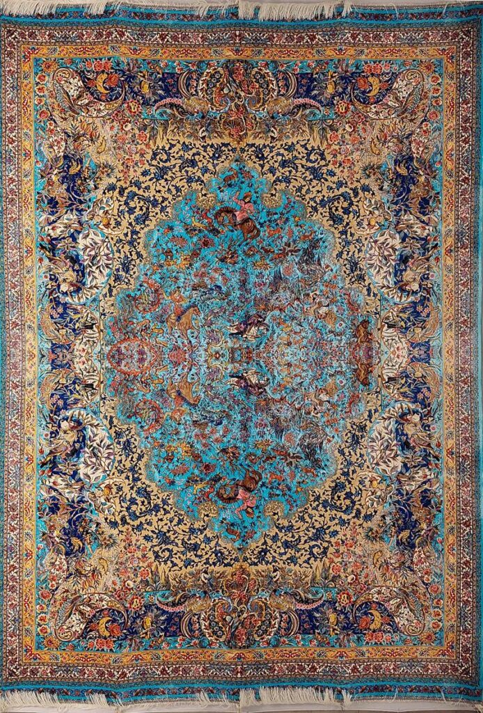 ربات بافت قم 200*300 مستطيل شکارگاه 70 ابريشم و بنبوسيلک فيروزه اي کرم 17 Kg فرش شادکام
