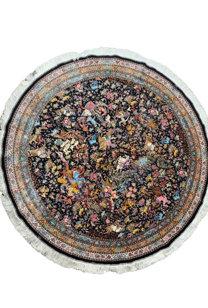 ربات بافت قم 200*200 دايره شکارگاه 70 رج ابريشم و بنبوسيلک مشکي الوان 5 Kg