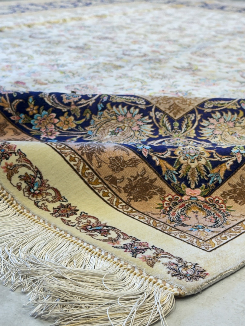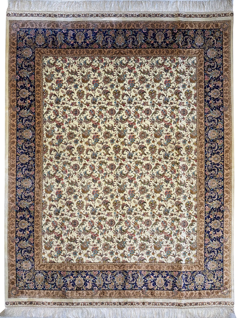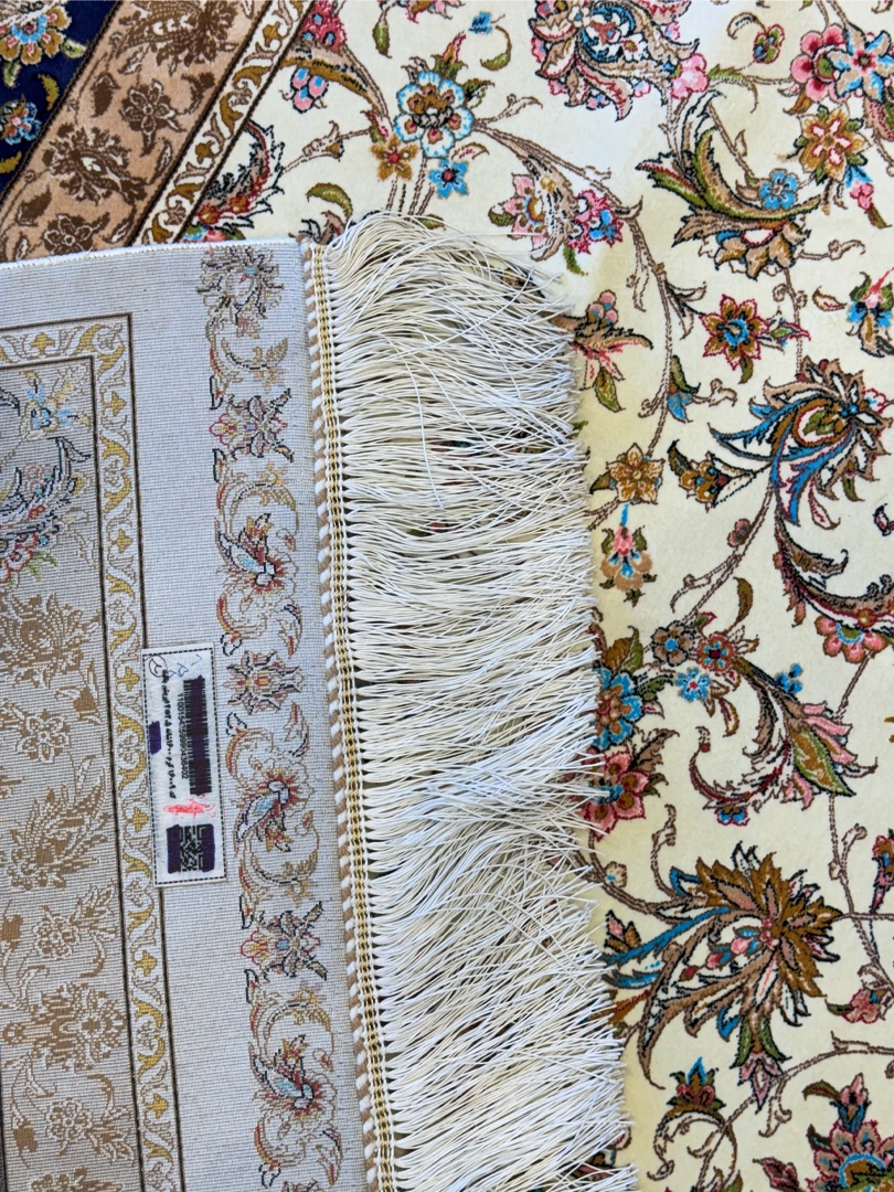 ربات بافت قم 200*250 مستطيل افشان 70 رج ابريشم و بنبوسيلک کرم سورمه ايي 17 Kg