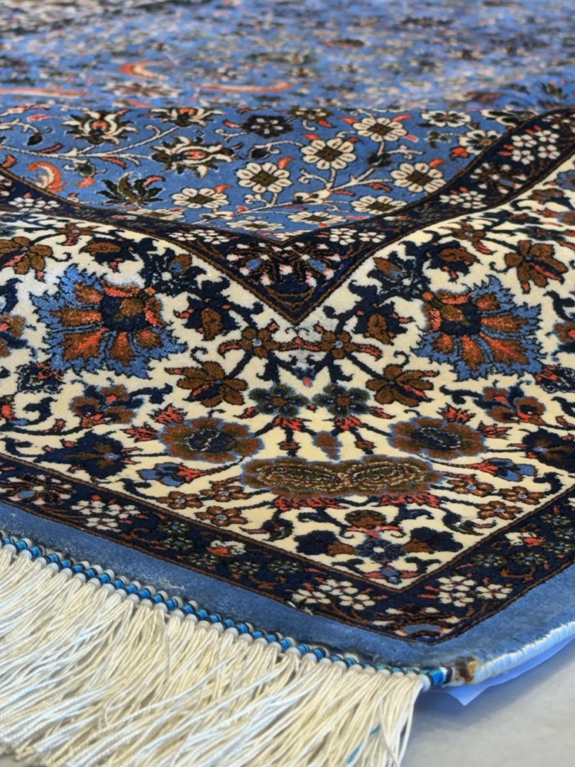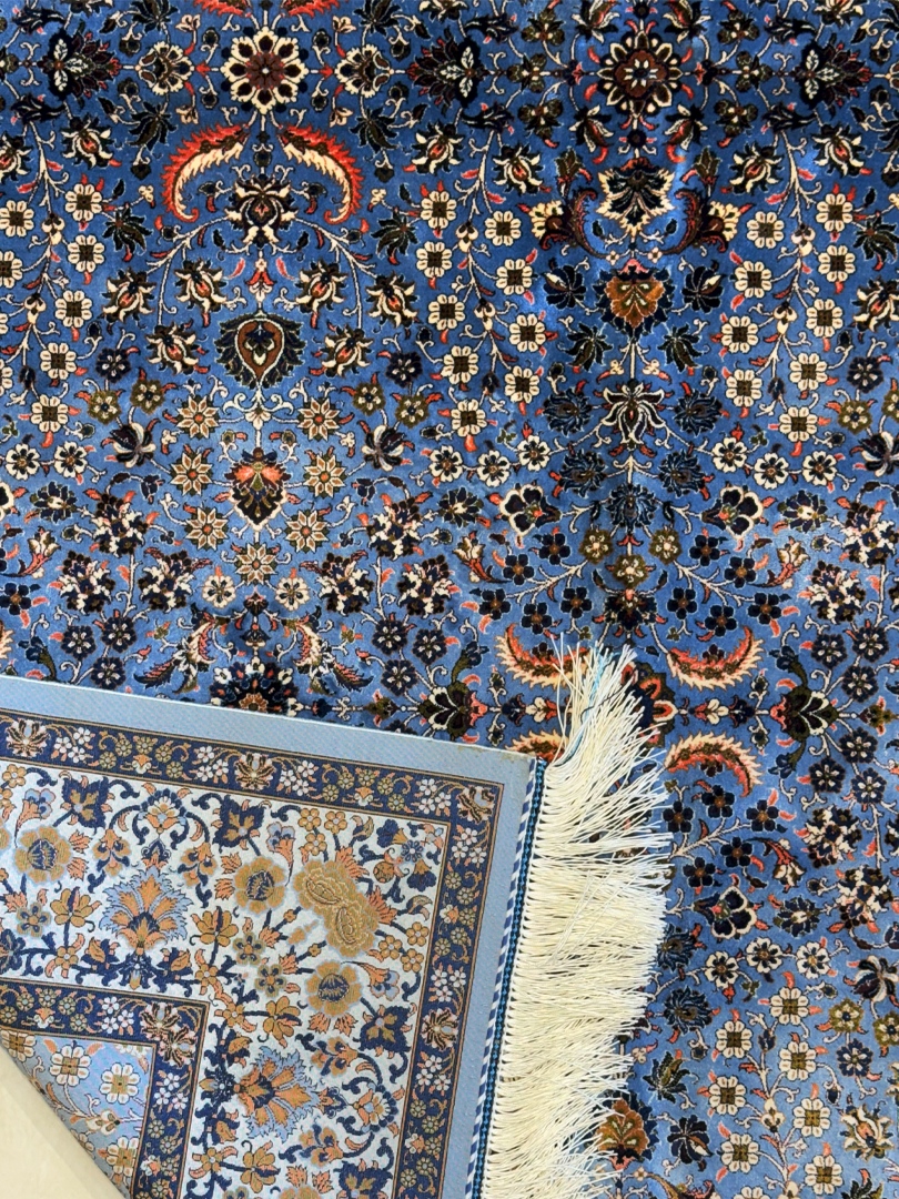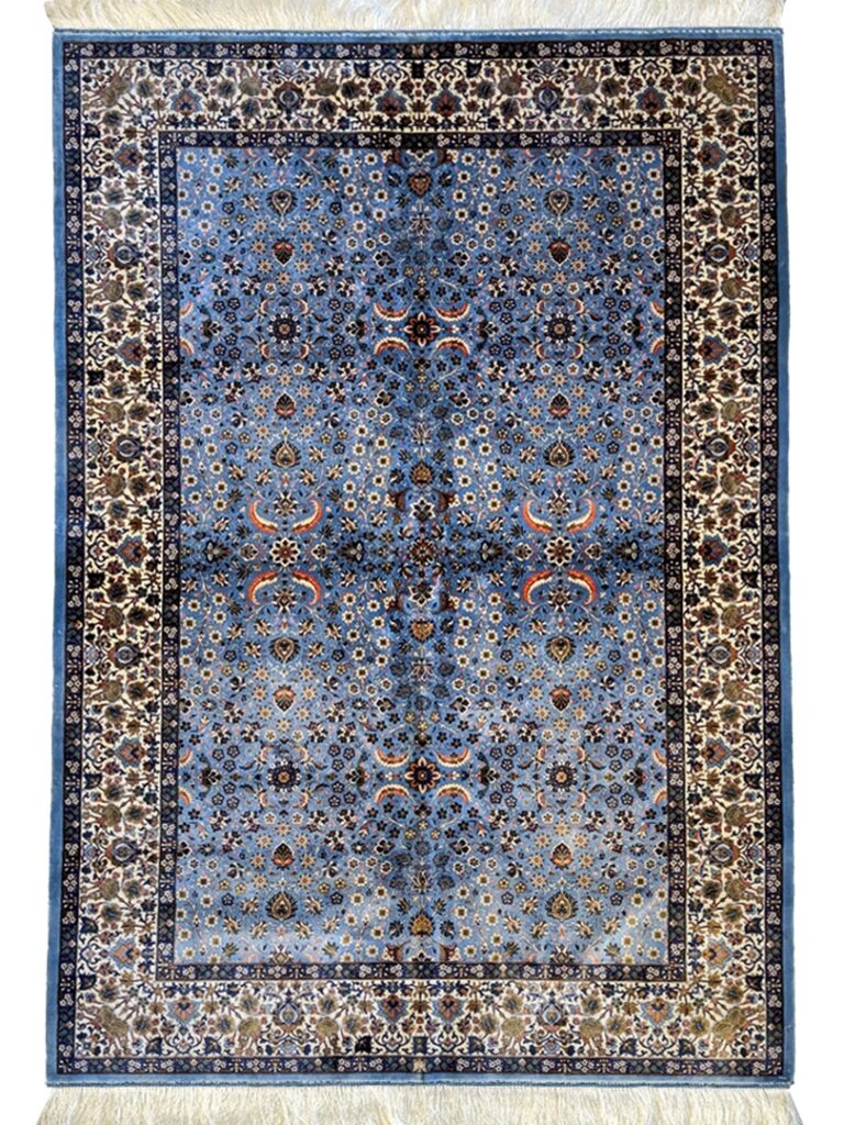 ربات بافت قم 120*180 مستطيل واگيره 70 رج ابريشم و بنبوسيلک ابي کرم 5 Kg