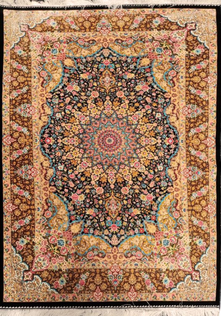 ربات بافت قم 100*150 مستطيل لچک ترنجي -شاه عباسي 70 رج پشم و بنبوسيلک مشکي مشکي 3 Kg