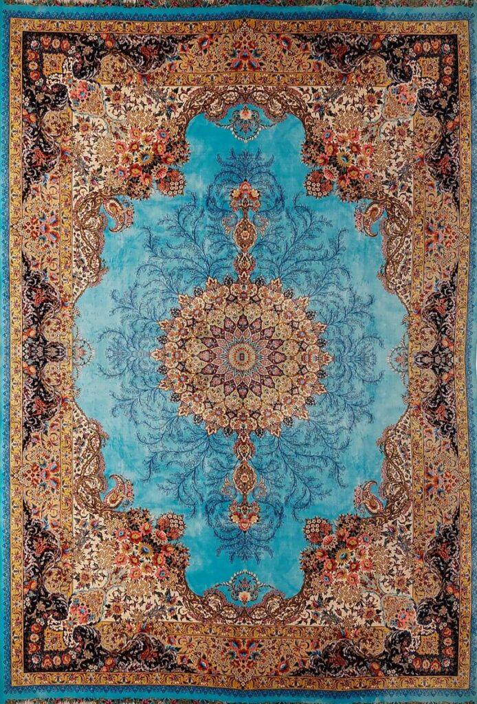 ربات بافت قم 200*300 مستطيل لچک ترنچي کف ساده 70 ابريشم و بنبوسيلک فيروزه اي آبي 23 Kg فرش شادکام