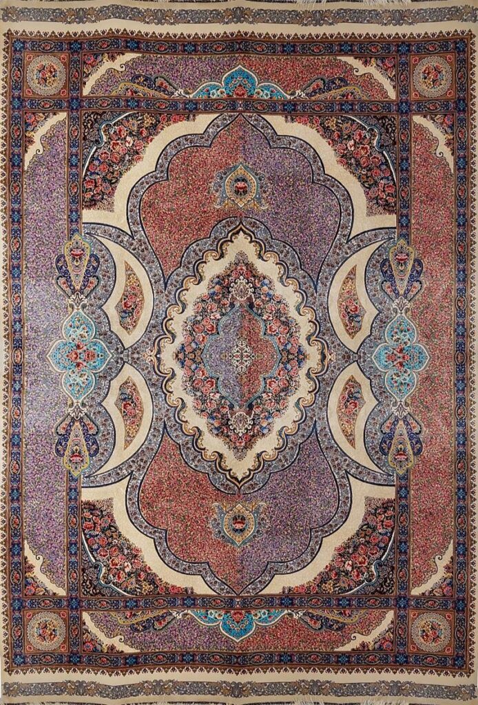 ربات بافت قم 200*300 مستطيل لچک ترنجي 70 ابريشم و بنبوسيلک شيري آبي 23 Kg فرش شادکام