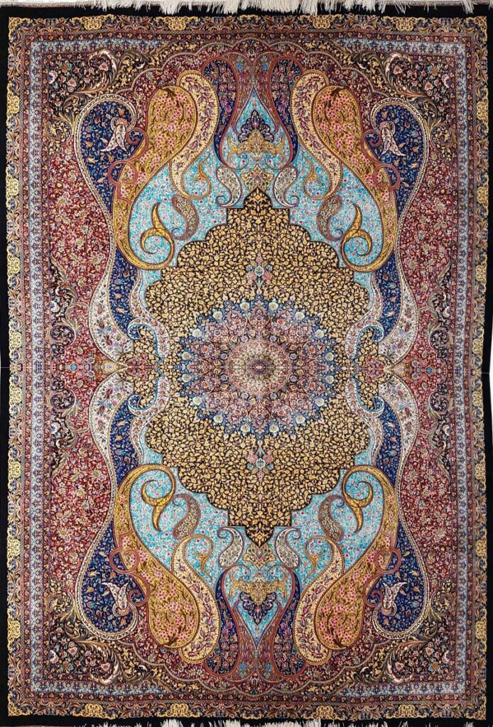 ربات بافت قم 200*300 مستطيل لچک ترنجي 70 ابريشم و بنبوسيلک کرم و طلايي سورمهاي 17 Kg فرش شادکام