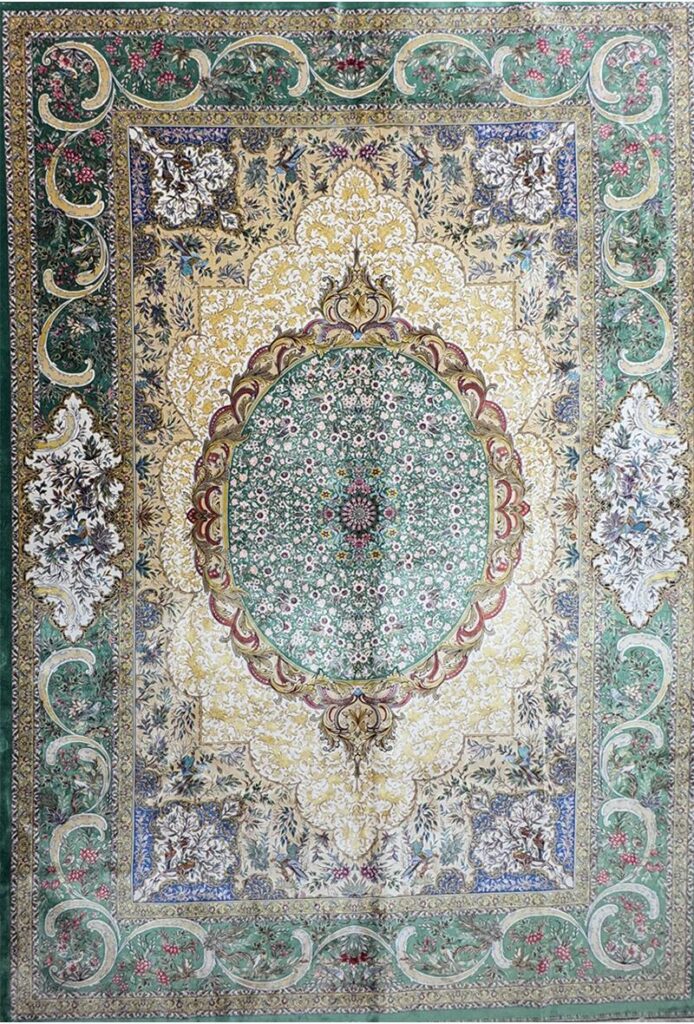 ربات بافت قم 200*300 مستطيل لچک ترنچي کف ساده 70 رج ابريشم و بنبوسيلک کرم سبز سبز 12 Kg